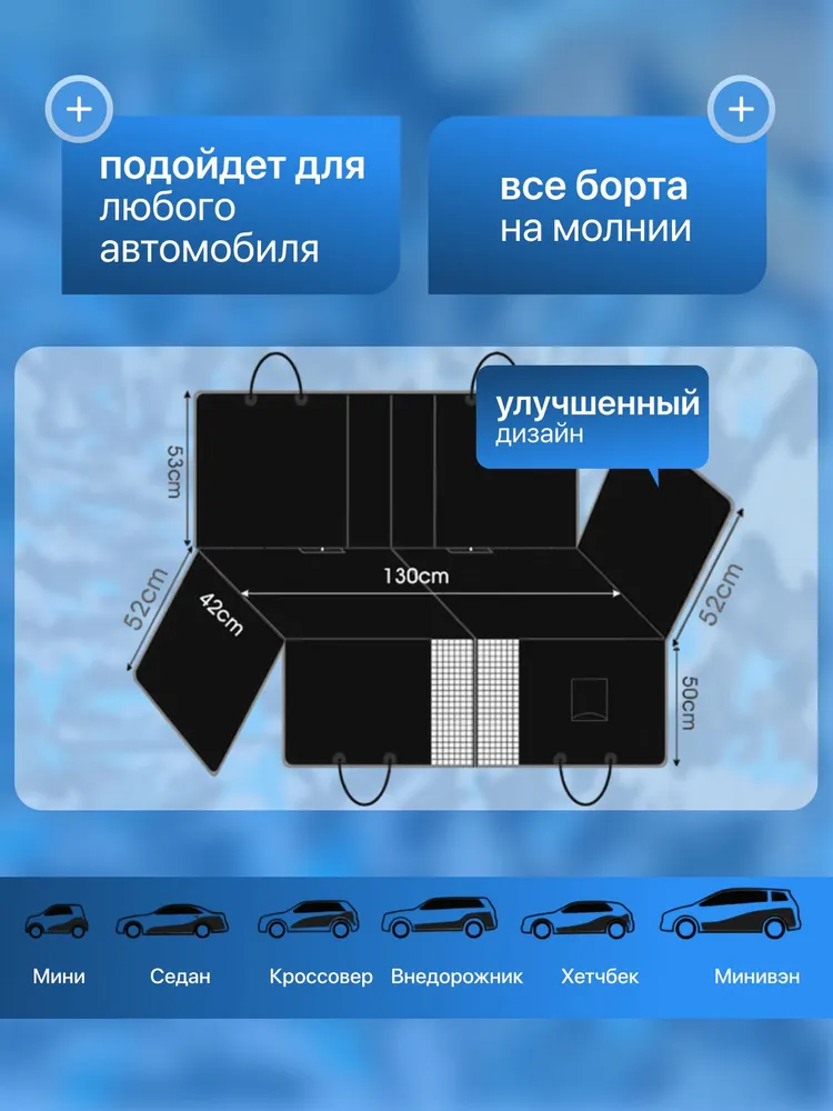 Используется на заднем сиденье или в багажнике, бортики на молнии создают удобный "вольер".Прочная и водонепроницаемая ткань (оксфорд с хлопковым слоем), легко чистится и стирается.Нескользящее основание для устойчивости питомца.Компактно складывается, в комплекте – сумка для хранения.Бортики защищают двери и пороги при посадке собаки.Легкий уход: протирка влажной тряпкой или стирка при 40°C.Характеристики