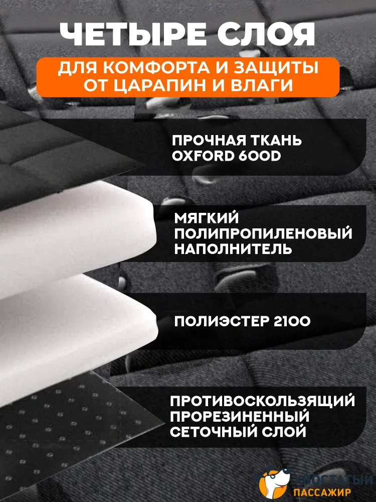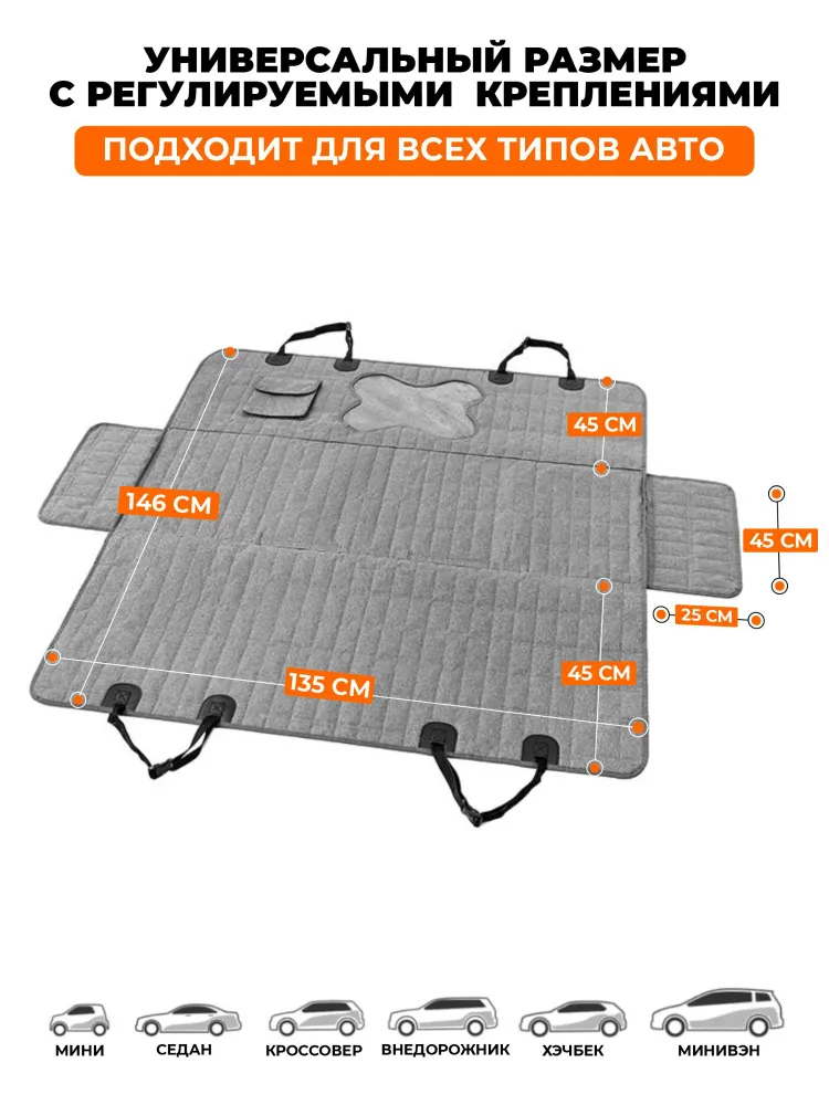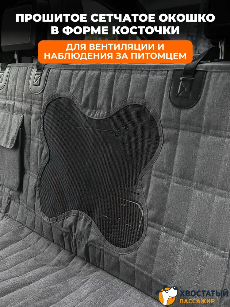 Автомобильный гамак для перевозки собак - отличный подарок автомобилисту собаководу!Автогамак позволяет сберечь нервы и значительную часть денежных средств за счёт экономии на автомойках и химчистке салона, которые больше не потребуются. Путешествуйте с любимыми собаками или другими шерстяными питомцами и не беспокойтесь за чистоту и внешний вид авто!Автогамак имеет несколько слоев - внешняя его сторона выполнена из высокопрочной и долговечной ткани Оксфорд 600, которая не допускает попадания пыли, влаги и грязи с лап питомца на обивку заднего ряда. Мягкая подкладка и плотный синтетический слой препятствуют разрыву ткани когтями и задерживают остаточную влагу. На нижнюю часть автогамака (также слой ткани Oxford 600D) нанесено резиновое покрытие, благодаря которому гамак не скользит по сиденью. А дополнительные якоря (вставляются между спинкой и сиденьем) создают дополнительную защиту от перемещений автогамака для комфортного путешествия питомца.Данная модель «Косточка» оборудована сетчатым окошком в форме косточки для лучшей вентиляции воздуха. Через него ваш питомец ещё сможет следить за обстановкой и своим хозяином в автомобиле. Также эта модель оснащена удобным карманом для различных мелочей - лакомств, игрушек.Установка укладывается в несколько простых действий - зафиксируйте изделие застёжками за подголовники и отрегулируйте высоту (для небольших автомобилей нужно будет затянуть ремни посильнее, а для крупных внедорожников наоборот, ослабить). Изделие готово к использованию!Преимущества автомобильного гамака:- Убережет салон от шерсти и грязи.- Легко чистится влажной тряпкой или в стиральной машине при 30°.- Универсальный регулируемый размер (подходит для всех автомобилей).- Прочный четырёхслойный состав.- Непромокаемый материал.- Стенки гамака создают подобие вольера. Во время движения собака не помешает водителю.- Защищает обивку от когтей.- Боковая часть расстёгнутого гамака кладётся на порог и защищает от царапин при посадке собаки.- В комплекте поставляется ремень безопасности для собаки.Мощный четырёхслойный состав