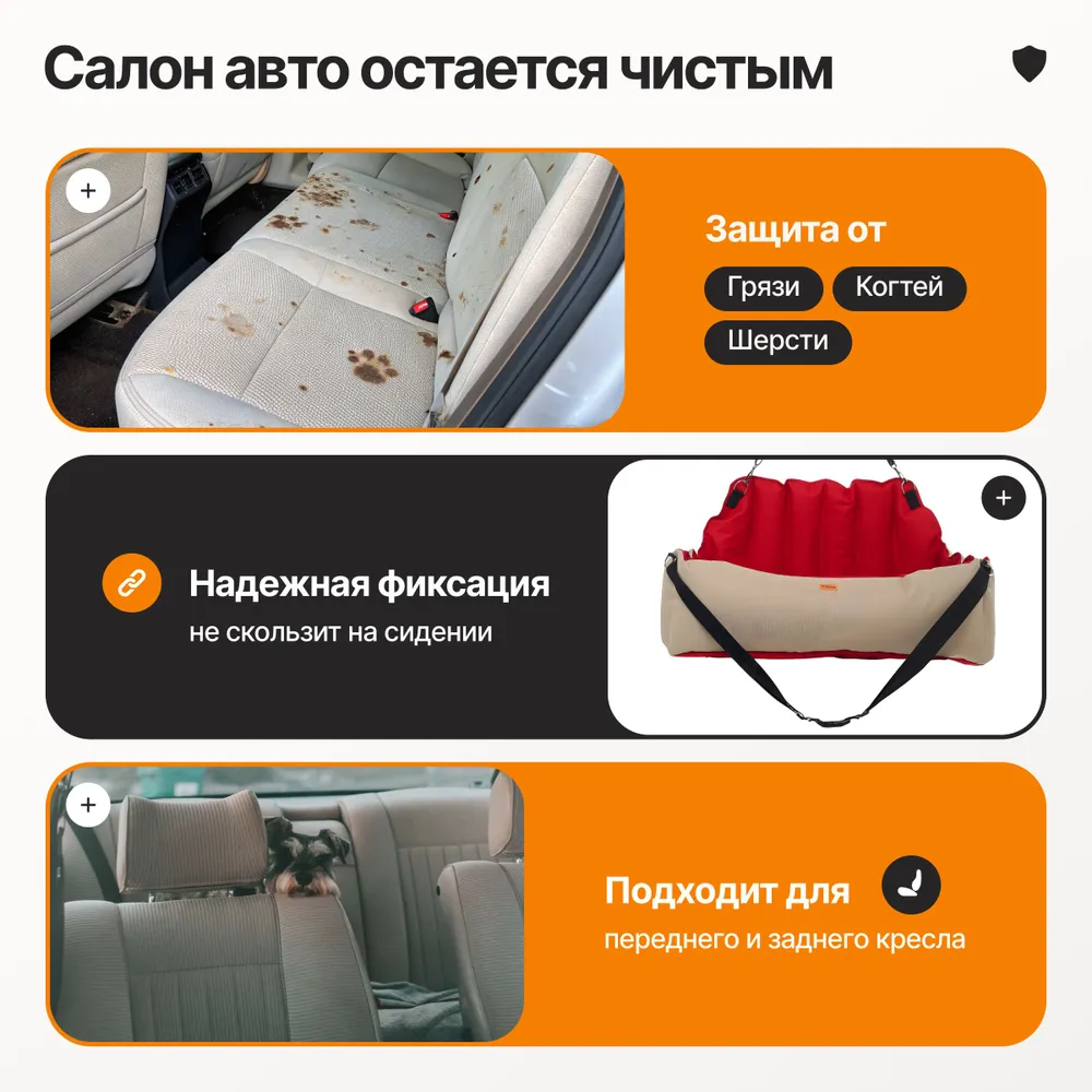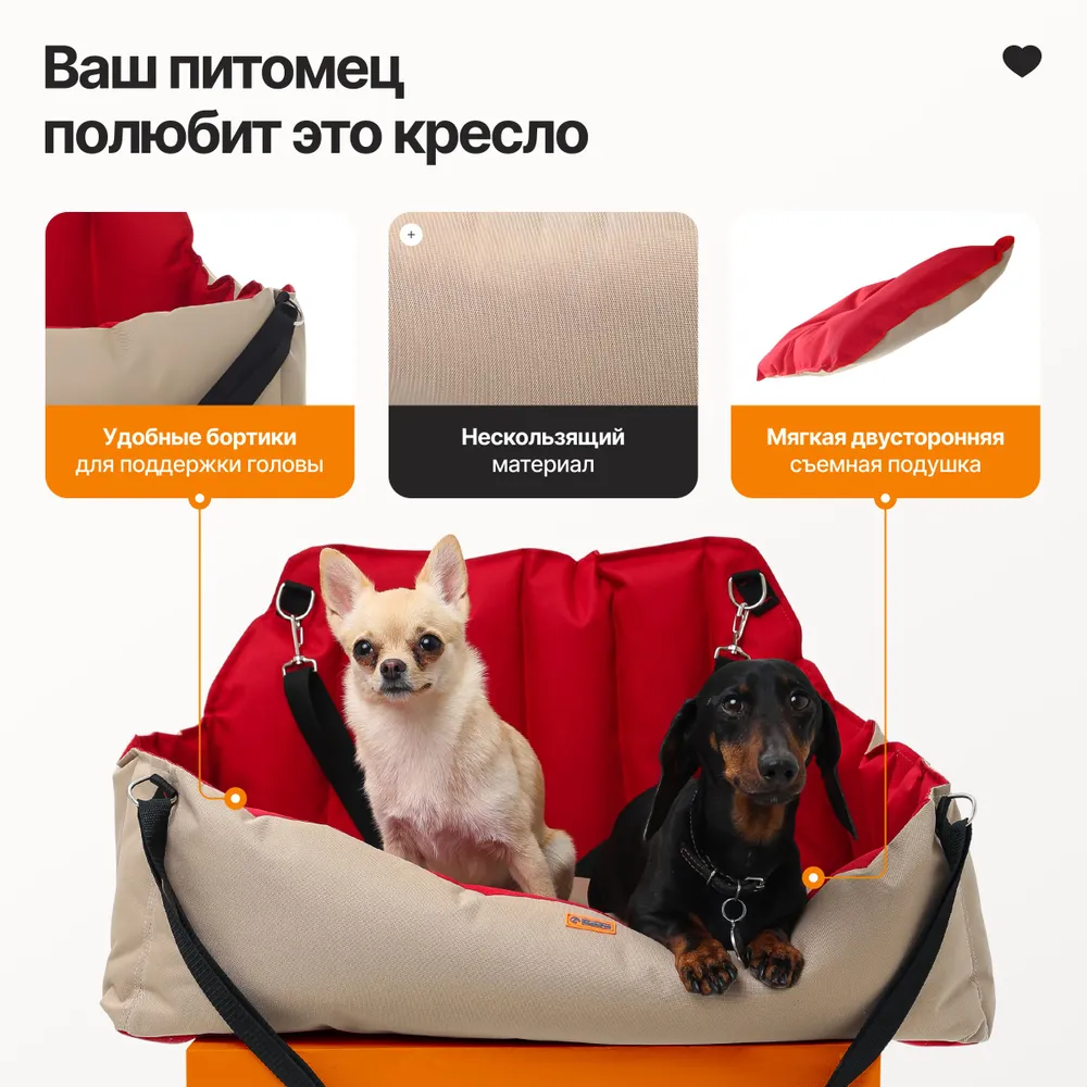 Надежный спутник на годы вперед01) Прочные швы и фурнитура02) Материалы устойчивы к когтям и зубам.03) Сохраняет внешний вид и функциональность после множества стирок.04) Разработано с учётом потребностей владельцев активных собак.Комфорт и безопасностьвашего любимца01) Удобная мягкая подушка снимает нагрузку на суставы.02) Устойчивость кресла предотвращает стресс у питомца.03) Форма бортиков создаёт ощущение защищённости.04) Исключает возможность скольжения или выпадения питомца.Универсальное использование01) Для передних и задних сидений любого автомобиля02) Подходит для дальних путешествий, поездок в город и на дачу03) Можно использовать как переноску или, как лежак в помещении04) Защита салона в любую погоду