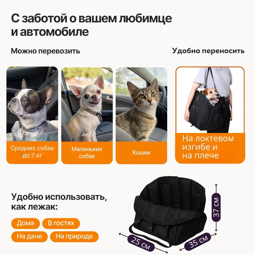 Сумка - автокресло - переноска для собак и кошек. Предназначена для мелких и средних пород собак. Это идеальное решение для вас и вашего питомца. Сумка автокресло легко устанавливается на сидение автомобиля. Ремень безопасности надежно зафиксирует автокресло полностью обхватив переднее сиденье.Высокое качество используемых материалов позволяет использовать сумку - автокресло не один год. Уход за автогамаком для животных в машину не требует много усилий. Незначительные загрязнения можно убирать влажной тряпкой. Подходит для стирки в стиральной машине. Размеры дна 25*37см высота 35см. Материалы: ПВХ ткань, Наполнитель синтепух. Фурнитура металл, пластик.Для дополнительной безопасности сумка автокресло оснащена мини поводком с карабином, собаку можно пристегнуть за шлейку или за ошейник к сумке, для более надежной перевозке вашего питомца. Так же автокресло оснащено двумя ручками и ремнем через плечо, благодаря этому автокресло можно использовать как переноску для животного.
