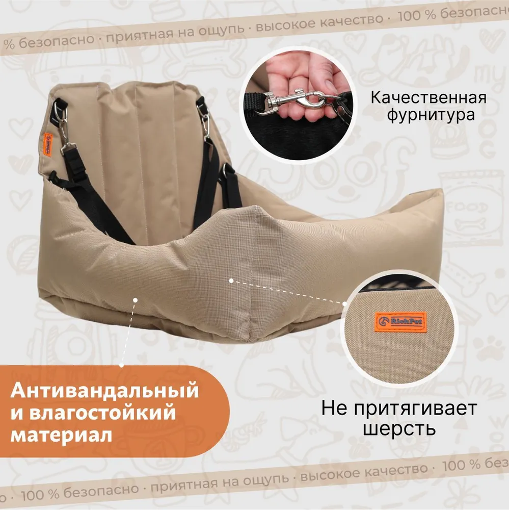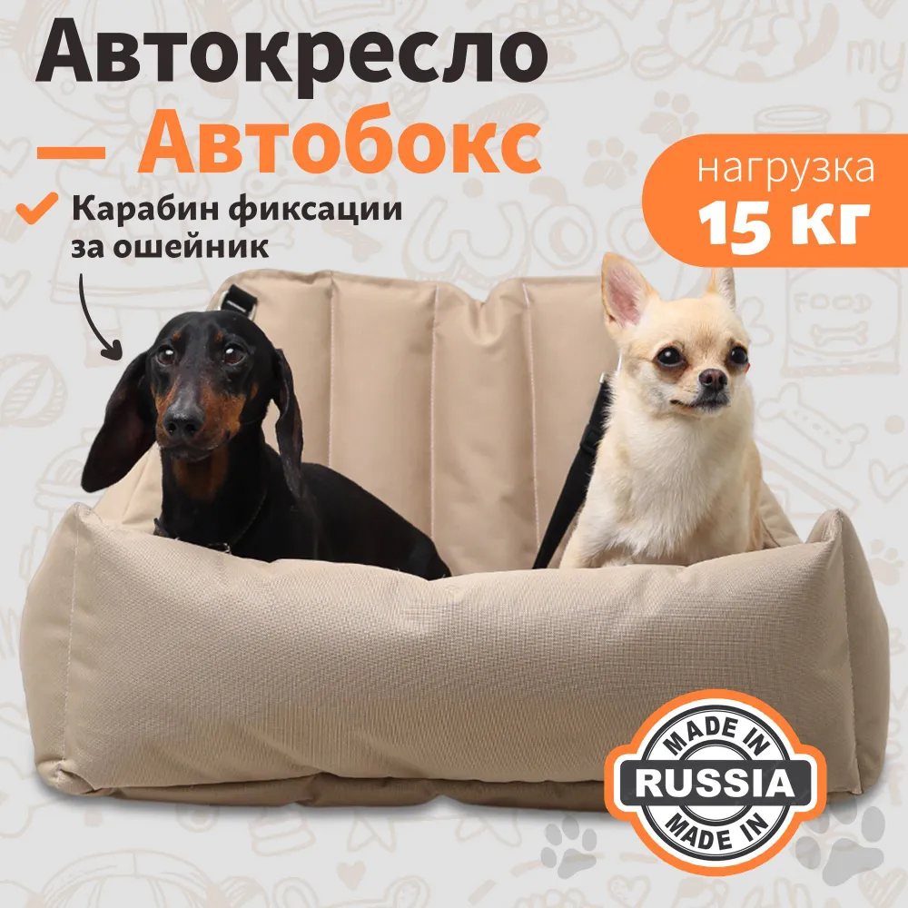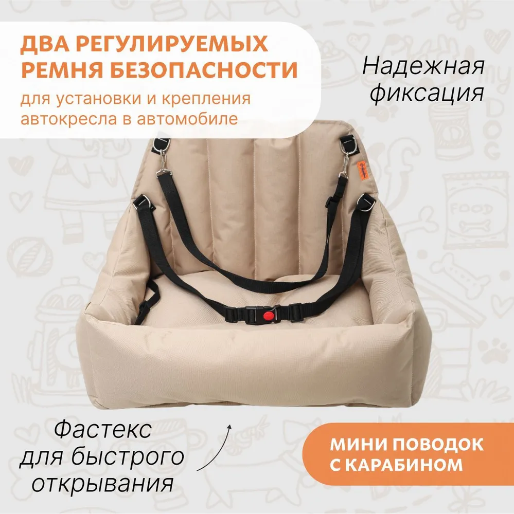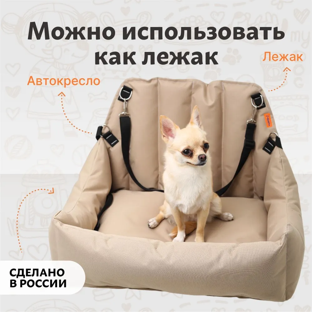 Автокресло - " Corgi". Предназначено для средних пород собак. Внешний размер изделия 45*60см, внутренний 40*45 см. Высота бортов 18*38см . Плотный износостойкий материал изделия, ткань не промокает, шерсть питомца не прилипает к изделию. Благодаря автокреслу ваш салон в автомобиле будет всегда чистым.Кресло можно устанавливать как на переднее так и на заднее кресло автомобиля. Кресло фиксируется ремнями безопасности за подголовник и само кресло автомобиля, оснащено фастексом с кнопкой фиксирующей открывание. Так же изделие оснащено мини поводком для более безопасной перевозки вашего любимца.Комфортное автокресло для собак можно использовать в автомобиле и на природе, как лежак для вашего питомца. Высокое качество используемых материалов позволяет использовать автокресло не один год. Уход за автокреслом для животных в машину не требует много усилий.Незначительные загрязнения можно убирать влажной тряпкой. Подходит для стирки в стиральной машине, в режиме деликатной стирки. Материалы: ПВХ ткань. Наполнитель синтепух. Фурнитура: пластик, металл.