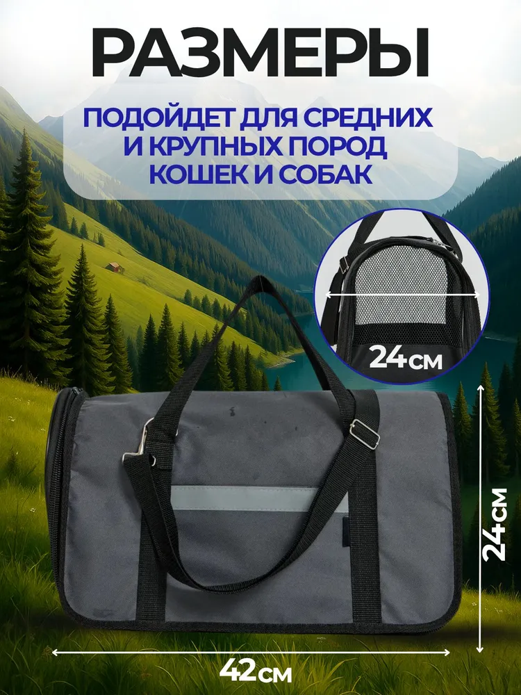 Идеальный выбор для безопасных и комфортных поездок с питомцем!Эта сумка-переноска сочетает в себе прочность, удобство и стиль, обеспечивая вашему питомцу комфорт во время путешествий. Подходит для кошек, собак мелких пород, кроликов и хорьков — идеально для клиники, дачи или поездок.Преимущества:Прочный и надежный материал — изготовлена из износостойкого полиэстера, который устойчив к царапинам и влаге, что гарантирует долговечность и сохранность сумки.Отличная вентиляция — сетчатые вставки обеспечивают хороший воздухообмен со всех сторон, создавая приятную атмосферу для питомца.Жесткое дно — твердое основание помогает сохранять форму сумки и обеспечивает дополнительный комфорт для вашего питомца.Легкость и удобство — мягкие ручки и регулируемый плечевой ремень делают переноску сумки удобной, даже с полным наполнением.Безопасность — надежные застежки и прочные молнии предотвращают случайное открытие и гарантируют защиту питомца в дороге.Характеристики:Материалы: полиэстер + дышащая сетка