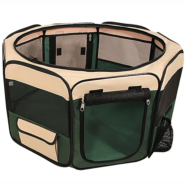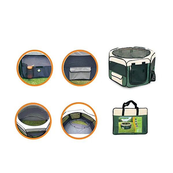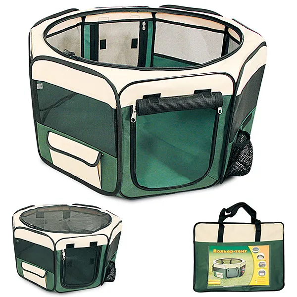 Вольер-тент для животных Triol "Манеж" M, 920*920*430мм (восьмигранник)Удобный складной матерчатый вольер-тент - универсальное решение для владельцев собак. Его можно использовать как на улице, так и в помещении в качестве основного места для собаки. Незаменимым атрибутом дом-тент является для владельцев собак на выставках и при перевозке во время длительных путешествий. Дополнительная сетка (идет в комплекте) не дает возможности животному выбраться, а вшитая металлическая конструкция в разложенном виде крепко натягивает ткань, обеспечивая изделию максимальную устойчивость. Изделие имеет удобное отделение для поилки, съемная сетчатая крыша позволяет питомцу свободно дышать, а непромокаемое дно надежно фиксируется при помощи липучек и легко стирается в стиральной машине. Цвет: бежево-зеленый. Размер 92*92*43см.Состав: Полиэстер, пластик, металл