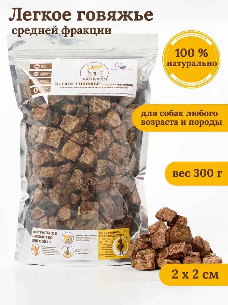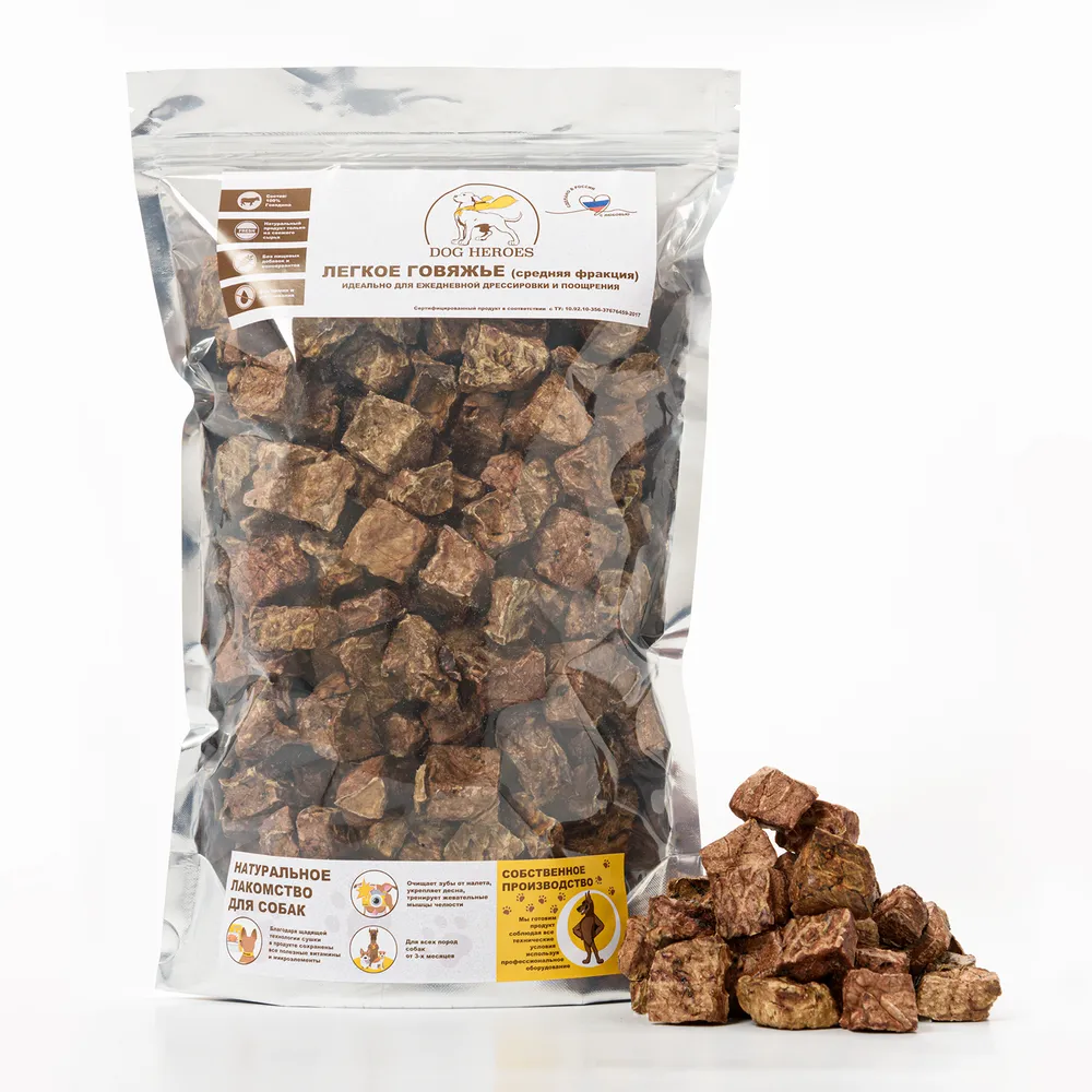 Говяжье легкое – одно из самых популярных лакомств для собак. Сушенное говяжье легкое - низкокалорийное и замечательно усваивается организмом любых пород.Главной особенностью является отсутствие жиров и углеводов в данном продукте, и содержит много качественного белка. Также сушенное легкое содержит множество витаминов и микроэлементов, необходимых для наших питомцев. Отлично подходит для ежедневной дрессировки Вашего питомца.Кусочки сушенного можно разломать на более мелкие кусочки. Герметичную упаковку 300 грамм удобно брать с собой на занятия и в дорогу.