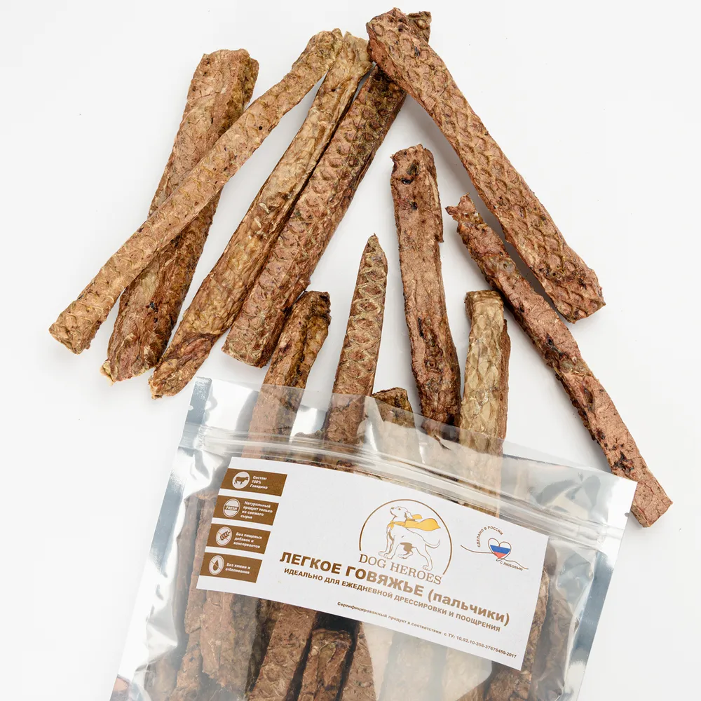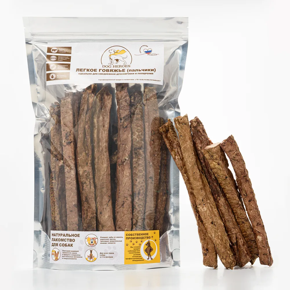 Говяжье легкое (пальчики) – нарезанное легкое палочками длиной от 5 и более сантиметров. Данная форма нарезки часто используется на тренировках собак хендлером при подготовке к выставке.Палочка легко ломается на нужные кусочки, поэтому продукт очень удобно использовать в качестве поощрения при тренировках, так и просто на прогулках. Также, часто используется для малых пород собак в качестве лакомства для погрызушек.Герметичную упаковку 150 грамм удобно брать с собой на занятия.