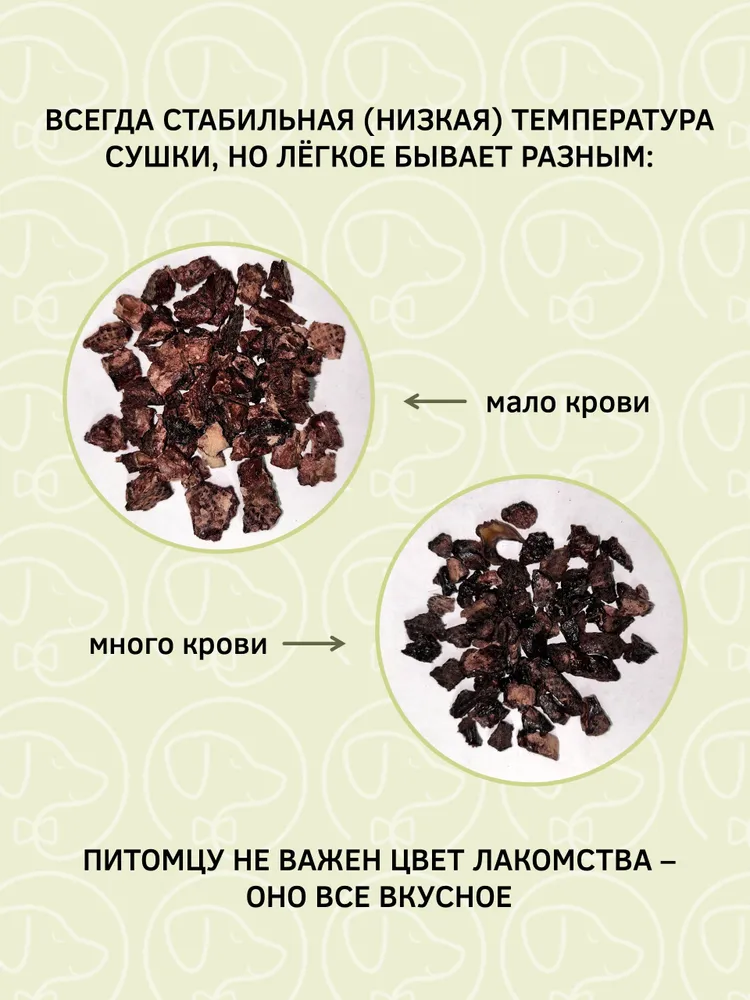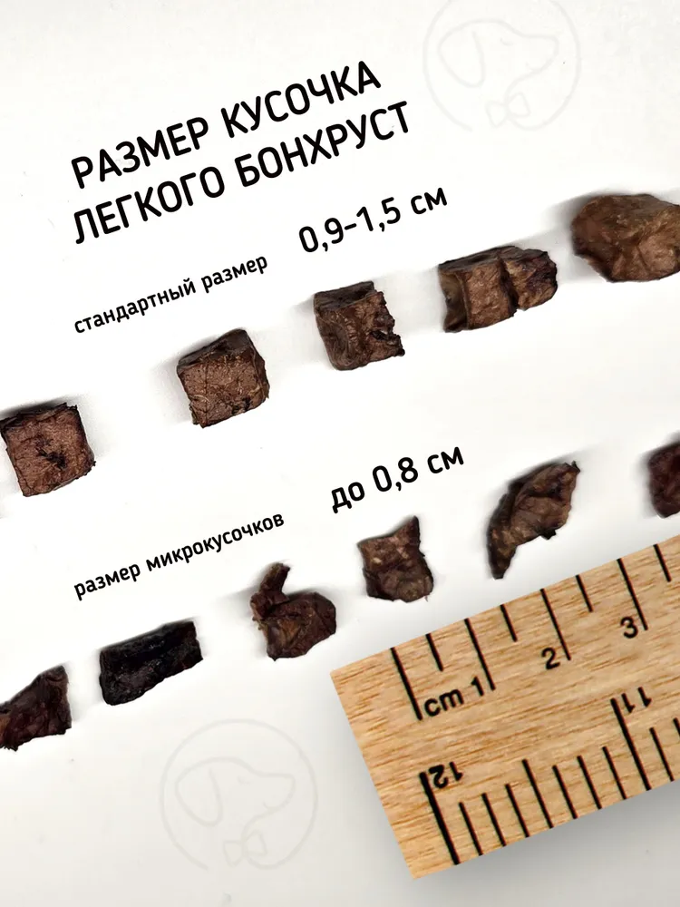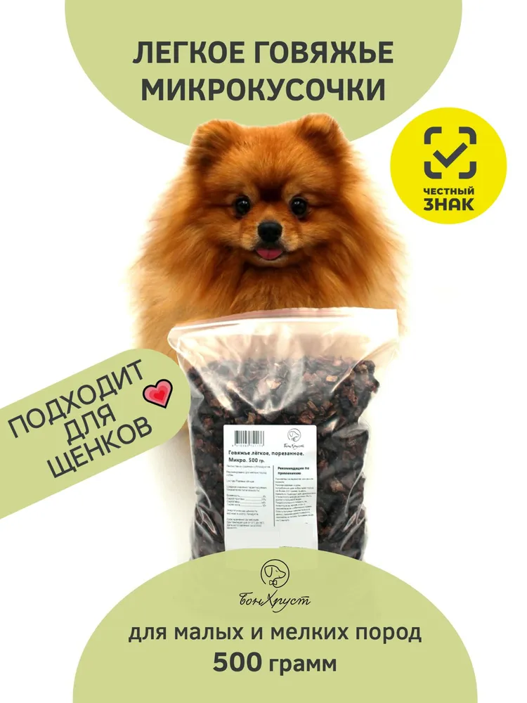 Натуральное лакомство для дрессировки мелких и средних пород.Наши преимущества:Идеальный размер для тренировок (до 0,8см) - маленькие кусочки быстро съедаются и собака не теряет фокус на занятии.Полезно и натурально - в составе 100% говяжье легкое без консервантов и искусственных добавок
