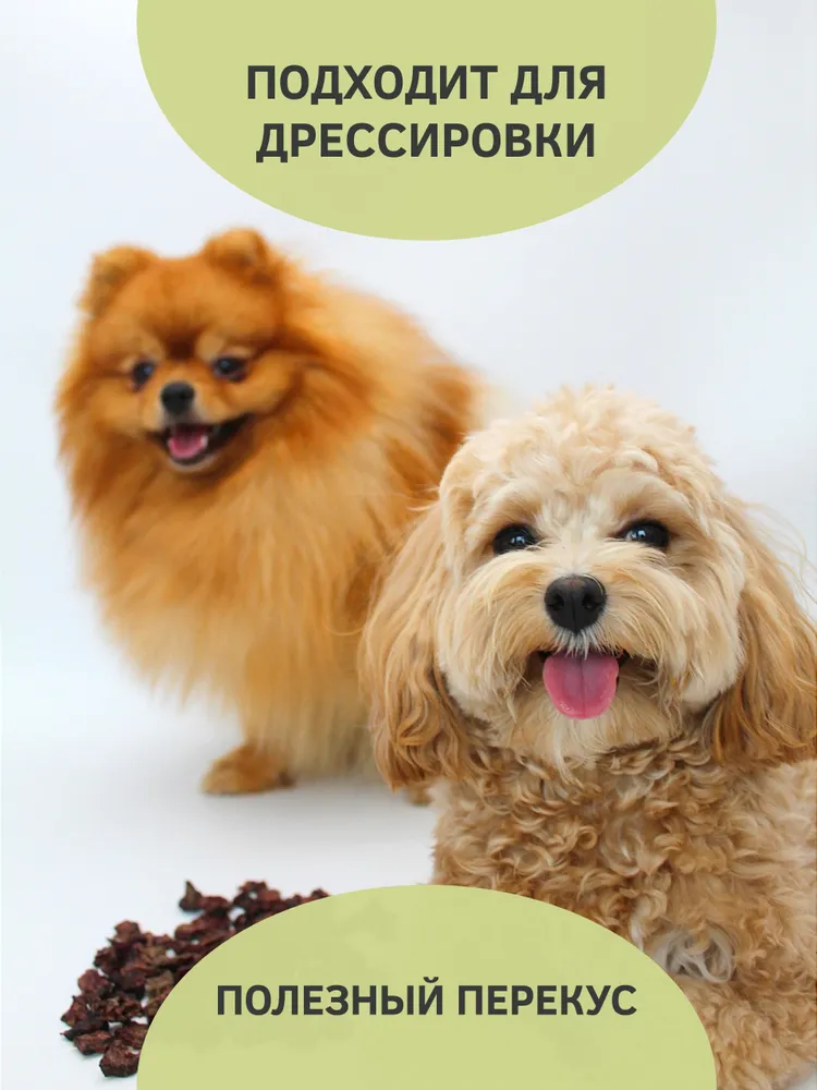 Польза для здоровья - подходит для собак с чувствительным пищеварением и болезнями ЖКТ. Не вызывает тяжести в желудке и легко усваивается в организме питомца. Это дополнительный источник белка, витаминов группы В, фосфора, железа и магния.Высокое вкусовое восприятие - невероятно ароматное и желанное угощение для любой собаки.Рекомендации по применению: Давайте по 5-15 кусочков в день, в зависимости от размера питомца в качестве поощрения во время тренировок (не более 10% от суточной нормы еды)