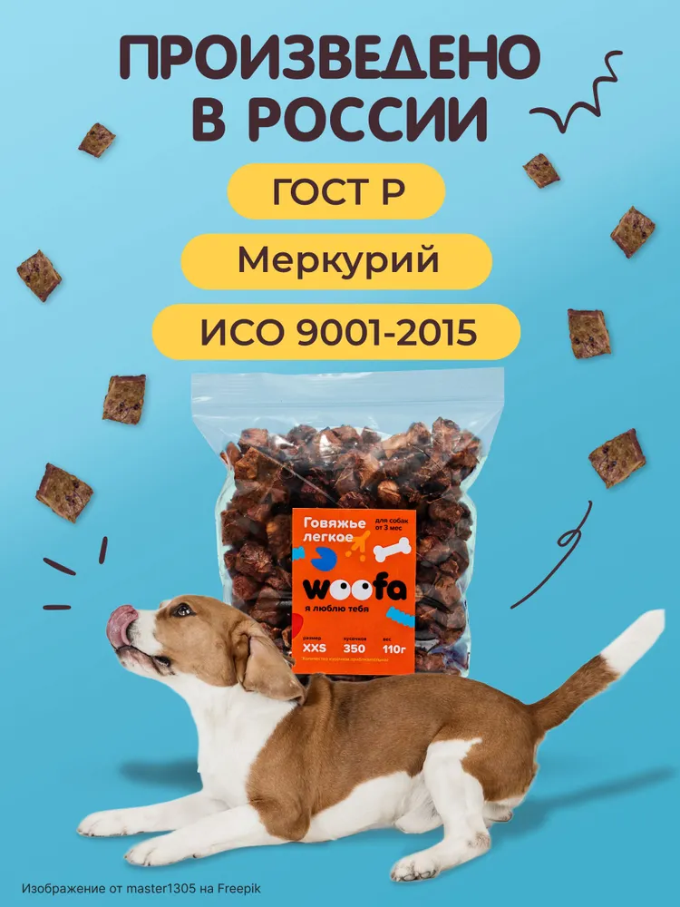 Лакомства WOOFA - если любишь своего питомца!Мы создали собственное производство лакомств из-за того, что наш щенок - померанский шпиц Шабли, отравилась покупными лакомствами самого популярного бренда.Говяжье легкое от WOOFAНатуральное на 100%, низкокалорийное - всего 82 ккал на 100 грамм, с высоким содержанием белка - 15,5 грамм в 100 граммах, говяжье легкое отлично подходит для дрессировки, перекусов и поощрения наших любимых хвостиков!