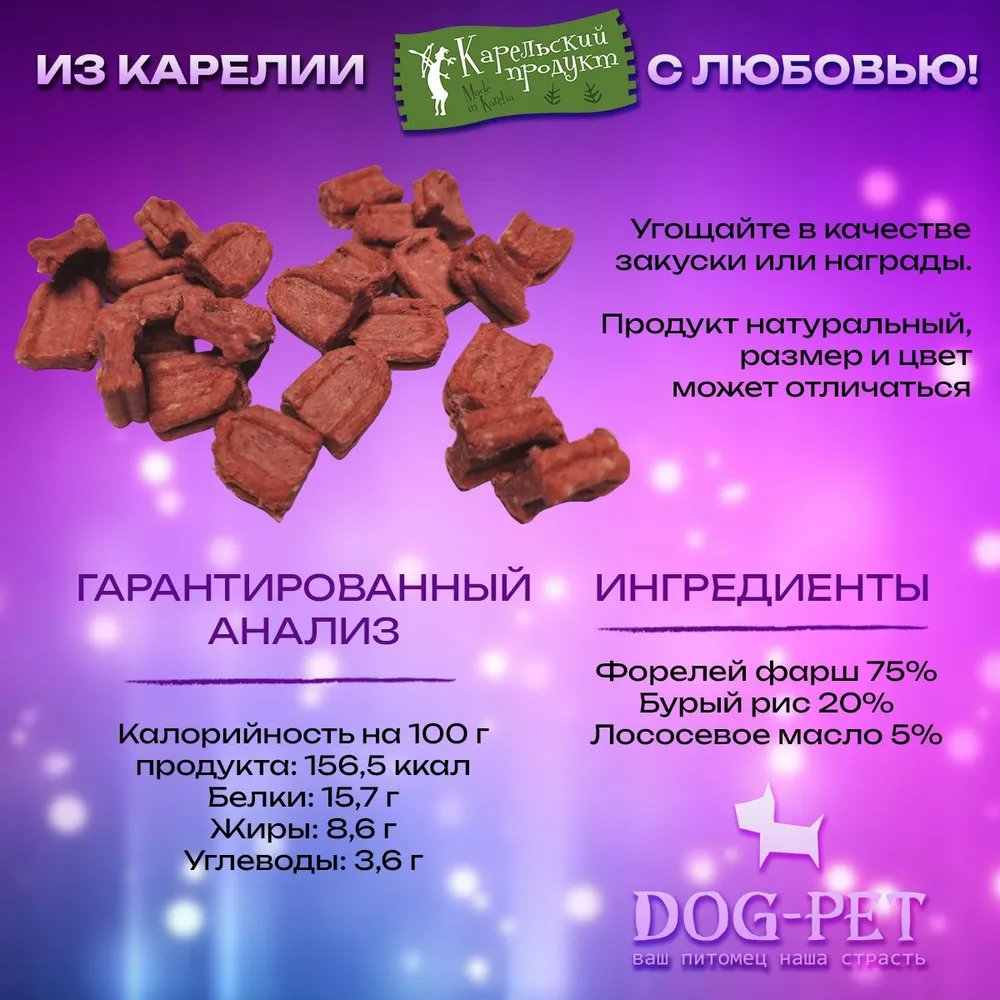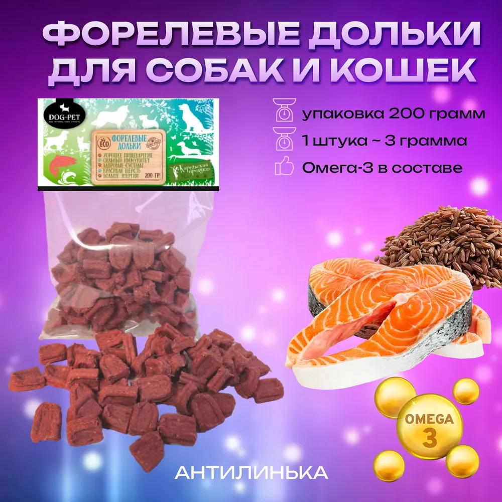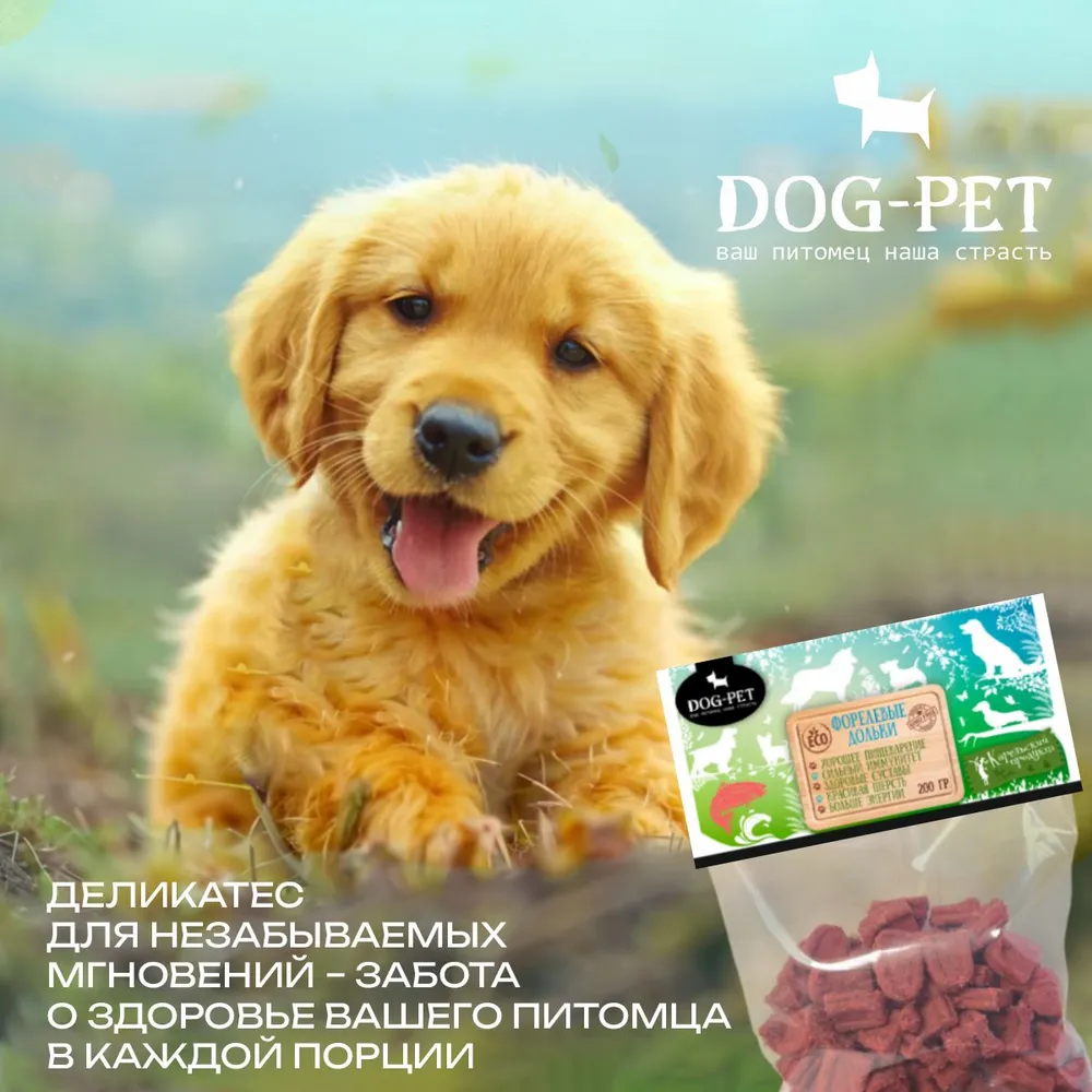 Лакомства Dog-Pet Форелевые дольки - отличный выбор для вашего питомца! Упаковка весом 200 г подходит как для собак мелких пород, так и для кошек. Эти вкусные дольки не только порадуют вашего любимца, но и станут полезным дополнением к его рациону. Лакомства имеют высокое содержание белка и низкое количество жиров, что идеально подходит для поддержания здорового веса у домашних животных.Форелевые дольки являются отличным вариантом для поощрения вашего питомца в процессе дрессировки. Легкий и натуральный состав делает их идеальными как для молодых собак, так и для более взрослых. Ваш собака оценит их вкус, а вы сможете быть уверены в качестве и полезности каждого укуса.Кроме того, эти лакомства отлично подойдут для собак всех пород, включая средние и крупные породы. Удобная упаковка позволяет удобно брать лакомства с собой в поездки или на прогулки, чтобы быстро наградить вашего четвероногого друга за послушание или просто за хорошее настроение.Форелевые дольки легко усваиваются и не содержат искусственных добавок, что делает их безопасным выбором для ежедневного угощения.