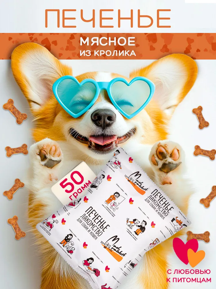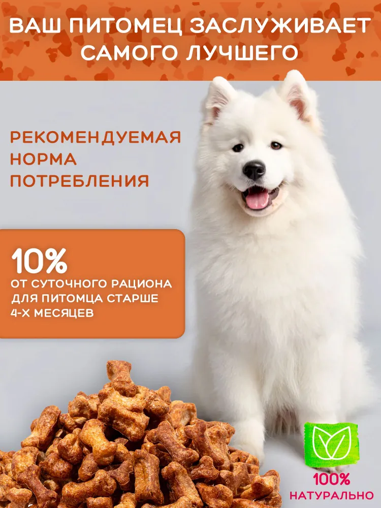 Без усилителей вкуса и запаха! Не промышленный корм.Вкусняшка для собак идеально подойдет для тренировки и поощрения вашего питомца. Оно не испачкает вам руки и карман, имеет маленькую удобную форму. Вдобавок, лакомства для собак можно ломать.Без ГМОНаши вкусняшки для собак не имеют в своем составе усилителей вкуса и запаха, красителей, мясокостной муки. Мы не используем никаких вредных наполнителей в печенье для собак. Каждый кусочек нашего лакомства для собак - это концентрат заботы и любви.Для всех пород