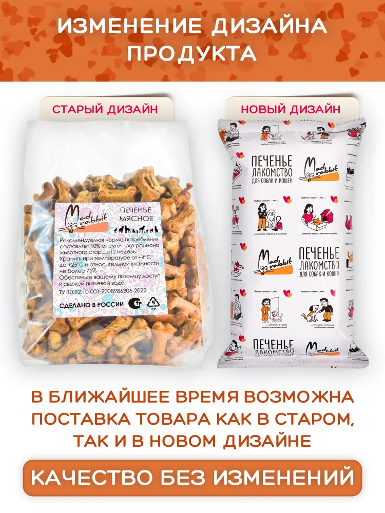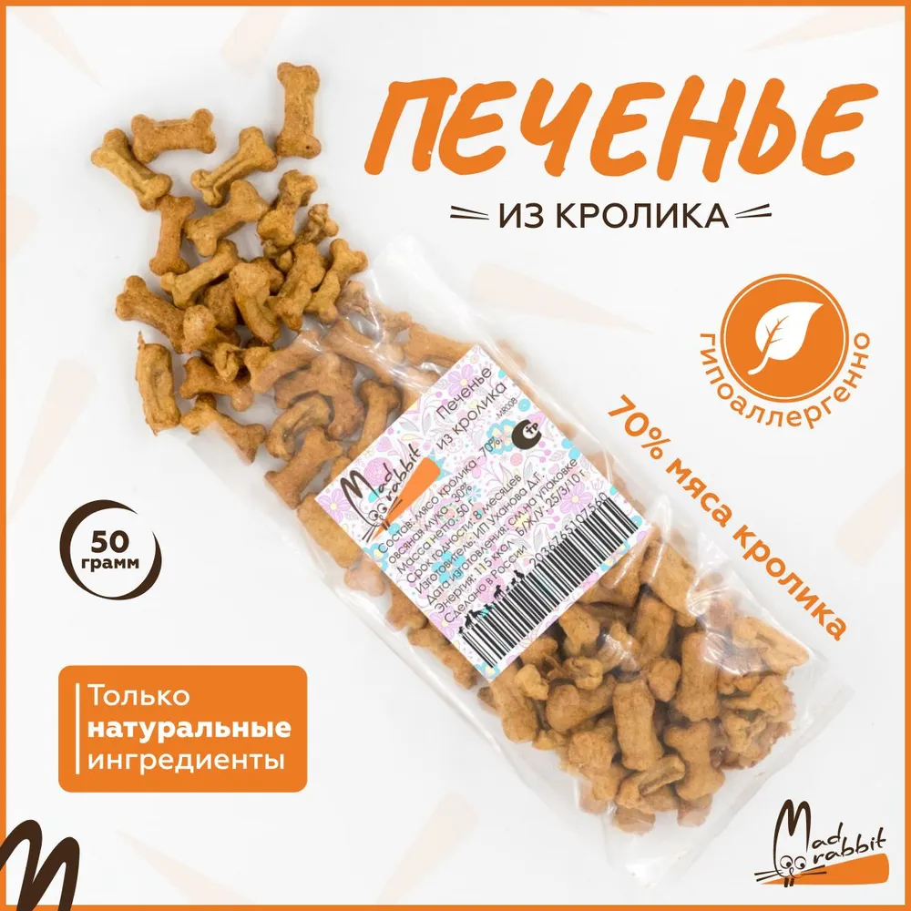 Каждый кусочек лакомства – это только высококачественные натуральные ингредиенты. Использование специальных технологий запекания позволяет сохранить все его полезные вещества и первозданный вкус без использования консервантов.Вкусняшки для собак Mad Rabbit - это низкокалорийное удовольствие. Поэтому наше печенье для собак подойдет и для тех, кто на диете. Мы используем непромышленный способ производства вкусняшки для собак, чтобы сделать бисквиты максимально безопасными.