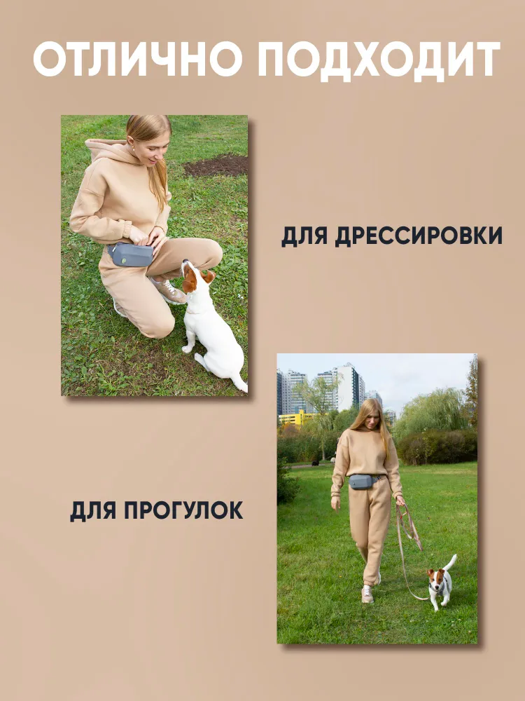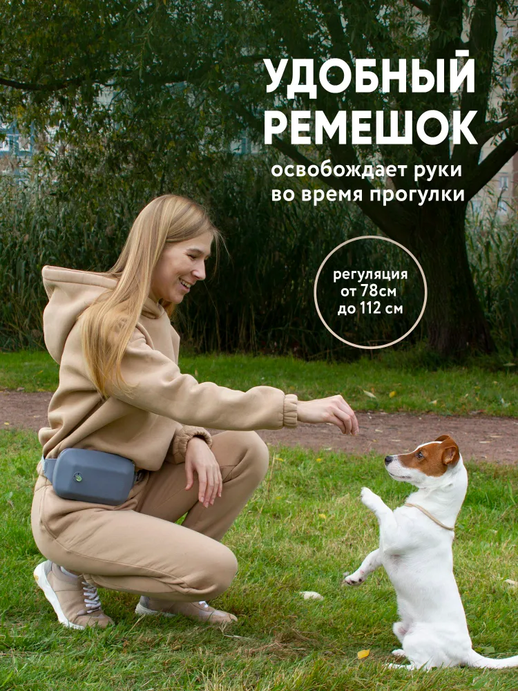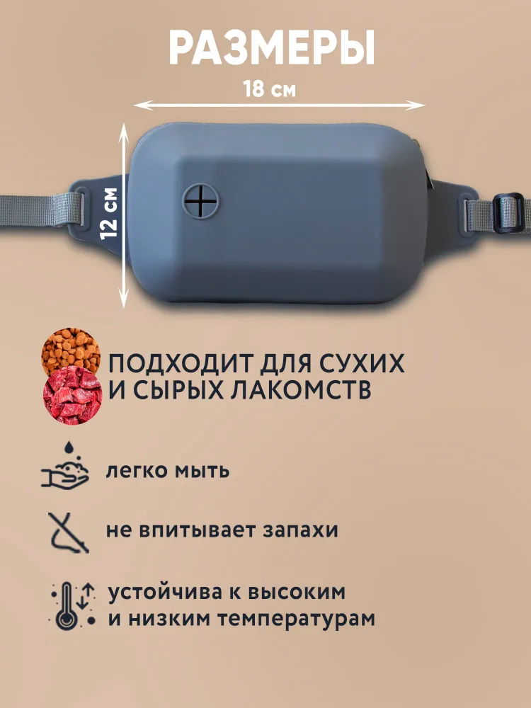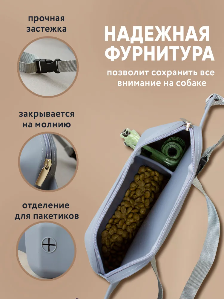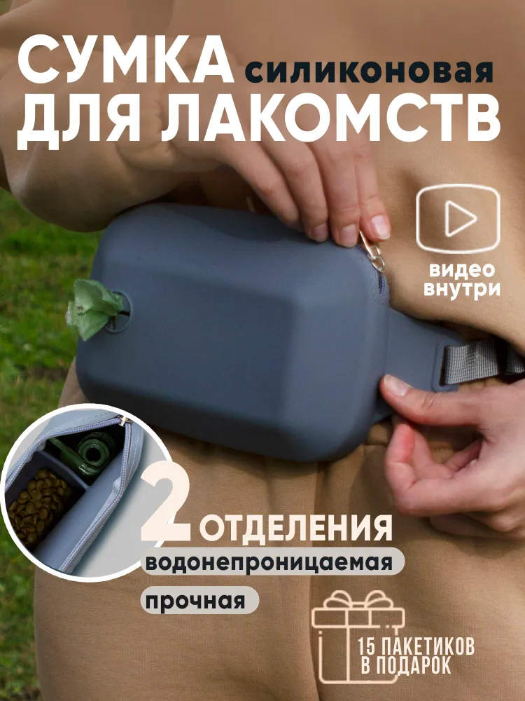 Наша силиконовая сумка для вкусняшек и для дрессировки собак создана специально чтобы в разы улучшить ваши прогулки и путешествия с вашим питомцем. Благодаря своей легкости, форме и поясной фиксации с помощью тканевого ремешка на пластиковом карабине, бег и тренировки на улице будут ещё более эффективнее и увлекательней. Удобная в использовании застежка - молния создаст максимальную защиту угощения от влаги или солнца. В сумке имеется два влагозащитных отделения. Одно используется для кормления. Подходит, для любых видов сухого или влажного корма из контейнера, различных угощений или готовой домашней еды. Второе используется для хранения и удобного извлечения мешков или пищевых пакетов для собак. Один рулон таких мешочков мы уже расположили внутри в качестве небольшого подарка.ЕСЛИ МЕШОЧКА НЕТ, ЗНАЧИТ ЕГО КТОТО УТАЩИЛ. Не будем на них обижаться. Данная сумка изготовлена из качественного пищевого силикона и благодаря этому не создаст травм зубов щенка, не прихотлива в уходе, стирке и хранении в доме. Она не промокнет в дождливую погоду и легко перенесёт любые низкие температуры. Регулируемый ремень имеет достаточно большую длину, что позволяет носить сумку дрессировщика как на поясе, так и через плечо, освобождая ваши руки во время выгула и дрессировок. Приятные и нежные расцветки наших сумок замечательно впишутся в ваш гардероб одежды и в гардероб вашего пушистого друга. Данная сумочка настоящая находка и незаменимый помощник как для владельцев собак, дрессировщиков, кинологов ..так и для владельцев других видов животных: лошадей, кошек, котов, птиц или грызунов. Благодаря приятному виду, презентабельной упаковке и красивой форме вы можете использовать её в качестве наборов -подарков на День Рождения, как для хозяина, так и для его собачки. Мы гарантируем высокое качество и надежность товара, из нашего магазина. Если у вас возникнут какие-либо вопросы или потребуется помощь, не стесняйтесь обращаться к нам. Желаем вам всего наилучшего.