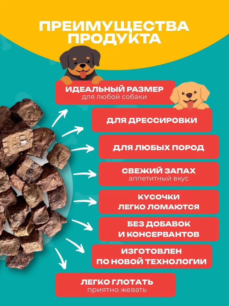 Кусочки высушенного говяжьего легкого. Современное профессиональное оборудование позволяет сохранить высокое содержание микроэлементов. Легкое очень вкусное, ни одна собака не сможет устоять! Кусочки очень удобно использовать в качестве поощрения при дрессуре, и просто на прогулках, при этом продукт не пачкает руки.Говяжье легкое содержит внушительное количество витаминов, при этом оно менее жирное, чем мясо. Лакомство оказывает положительное воздействие на состояние кожи, шерсти и пищеварительную систему. Низкокалорийный деликатес прекрасно усваивается организмом питомца. Лакомство можно употреблять животным с неполной зубной формулой и возрастными изменениями зубочелюстного аппарата. Благодаря вкусовым качествам и структуре деликатес является одним из самых любимых лакомств для наших питомцев. А главное, полезным! Продукт одобрен ветеринарами, имеет сертификаты:Декларация о соответствии РОСС RU Д-RU.РА01.В.05754/24Добровольный сертификат РОСС RU.З2001.04ИБФ1.ОСП28.46879Легкое подходит для собак и кошек разных пород, именно поэтому в наличии разные размеры кусочков: для более мелких и крупных пород. Для Вашего удобства лакомство представлено в разных объемах.
