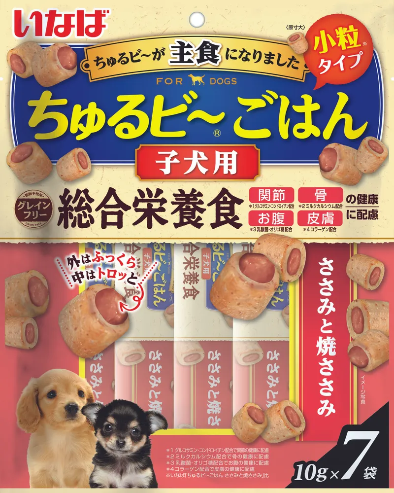 Супер-премиальное лакомство Churu Bee Gohan (ЧУРУ БИ ГОХАН) для щенков с нежной кремовой начинкой на основе филе фермерской курицы от японского производителя Inaba изготовлено исключительно из натуральных полезных ингредиентов. Запеченные трубочки имеют усиленный вкус вяленого тунца Кацуо, поэтому понравятся даже самым привередливым щенкам или малшыам с чувствительным пищеварением. Содержит в составе лактобактерии, которые улучшают пищеварение и нормализуют работу ЖКТ.\n\nЛакомства и вкусняшки Inaba отличаются высоким качеством и неповторимым вкусом, ведь они изготавливаются только из отборных традиционных японских ингредиентов! Удобная упаковка позволяет сохранить свежесть продукта надолго. Жевательные трубочки удобно использовать поощрения или дрессировки.\n\nВо все продукты добавлен экстракт зелёного чая, который, благодаря содержанию катехина, нейтрализует неприятные запахи содержимого кишечника. Лакомство обогащено витамином Е — натуральным антиоксидантом, поддерживающим иммуннитет животного. Не содержит искусственных добавок, красителей и консервантов, поэтому подойдут животным с чувствительным пищеварением.\n\nСнеки Inaba — это не только полезное, но и невероятно вкусное угощение для вашего маленького пушистого друга. Оно придётся по вкусу даже самому привередливому малышу и поможет им вырасти здоровыми и активными. Подходит для животных всех пород - мелких, средних или крупных.\nЛакомство дается, в дополнение к основному рациону (от 1 до 4 пакетиков в день в зависимости от размеров собаки)