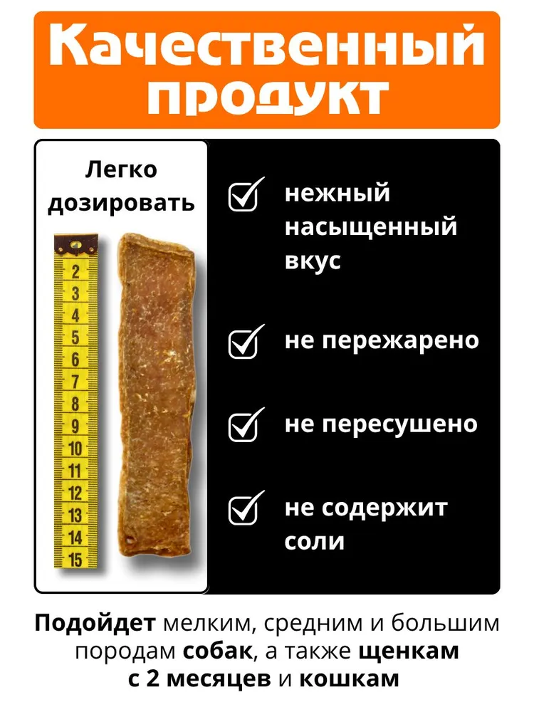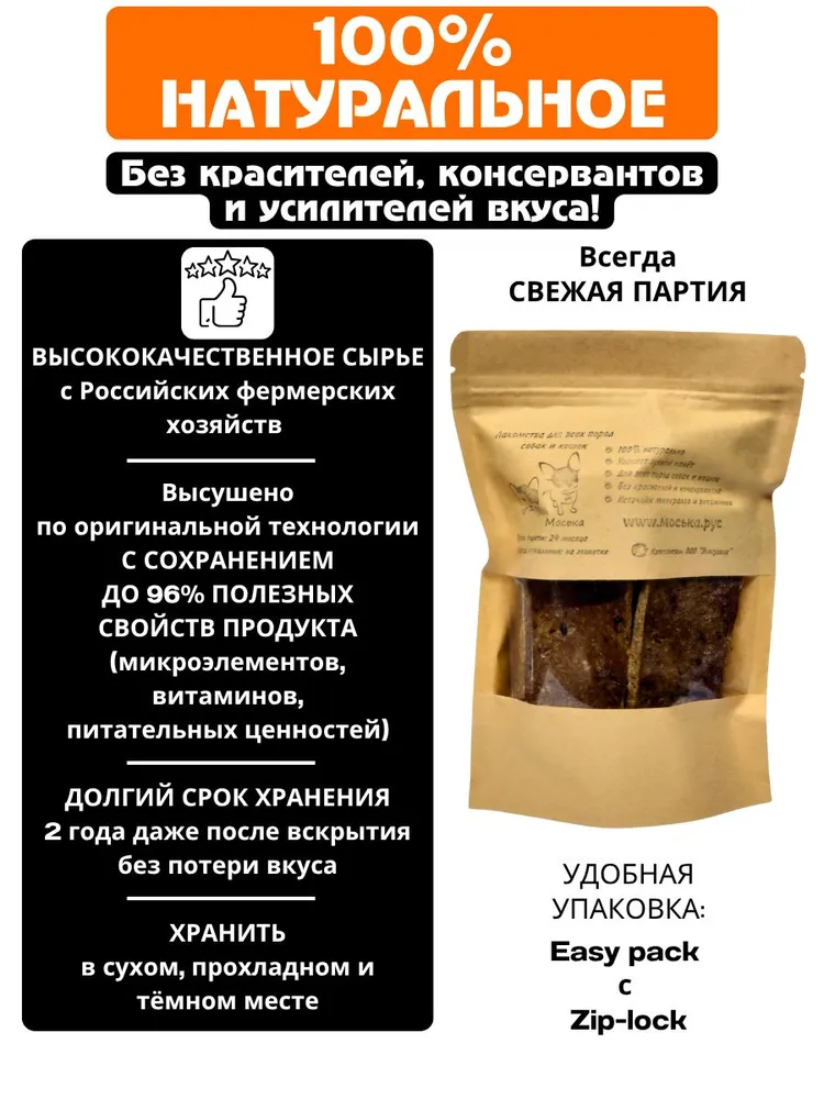 ~ Вымя говяжье для собак ~● Для всех пород и размеров собак.● Вымя говяжье это высококалорийный продукт. Белок коллагена, содержащийся в продукте, влияет на состояние сухожилий, костей, хрящей, кожи и шерсти животного.● Вымя содержит никотиновую кислоту, тиамин и рибофлавин (В3, В1 и В2). Оно богато микроэлементами калий, фосфор, натрий, кальций, железо, йод. Вымя - это отличное дополнение к ежедневному рациону здорового животного при активных тренировках, а так же в период беременности.● Наше производство, специализируется на изготовлении натуральных вкусняшек для животных, они очень полезны для здоровья собак мелких, средних и крупных пород.● Наши, деревенские лакомства для собак, богаты необходимыми витаминами и минералами. Они помогут удовлетворить потребность щенков что то погрызть, успокоят когда хозяина нет рядом, предотвратят проблемы со здоровьем зубов, помогают уменьшить образование зубного налета и предотвращают появление зубного камня.● Эти лакомства можно использовать как поощрение, награду, при дрессировке, а также как хрустящую дополнительную пищу в рационе вашей собаки.● Хрустики удобно взять с собой на прогулку и поощрять своего четвероногого друга во время тренировок. Вы можете использовать вкусные и полезные угощения, чтобы мотивировать своего преданного питомца и укрепить связь между вами.● Наши деревенские лакомства изготовлены из высококачественного сырья, поставляемого российскими фермерскими производителями.
