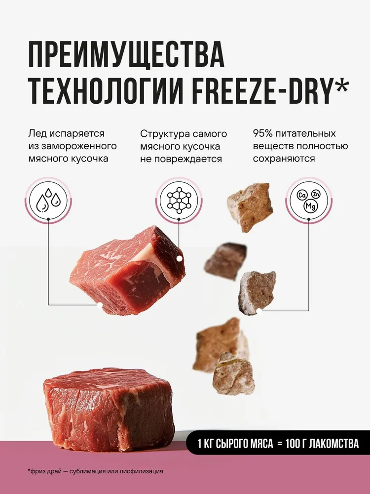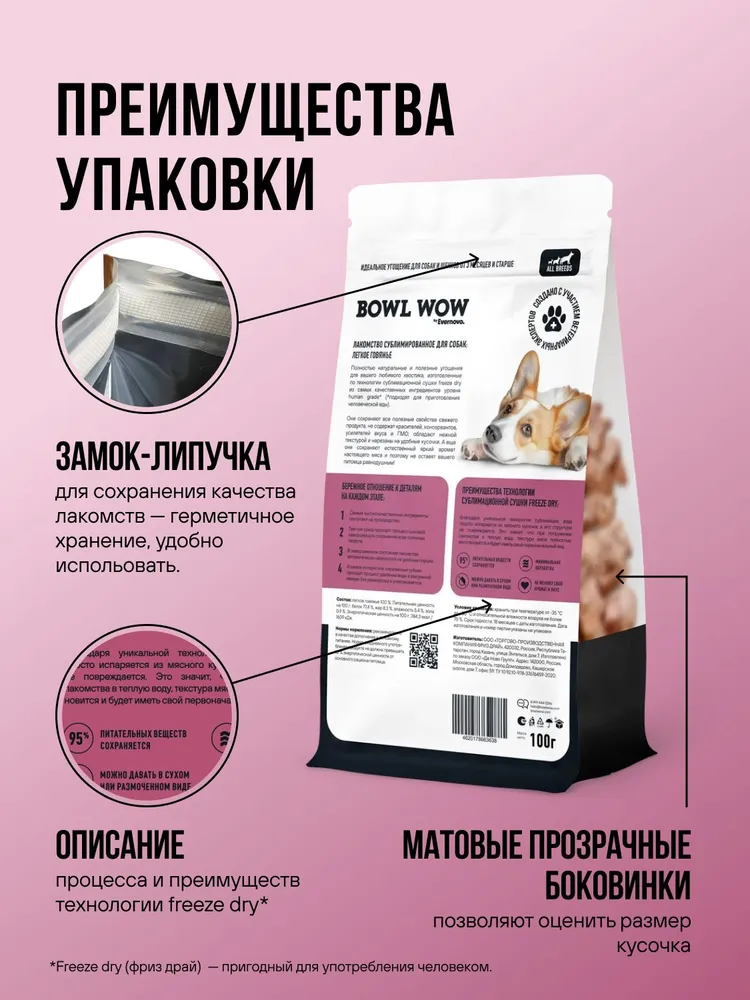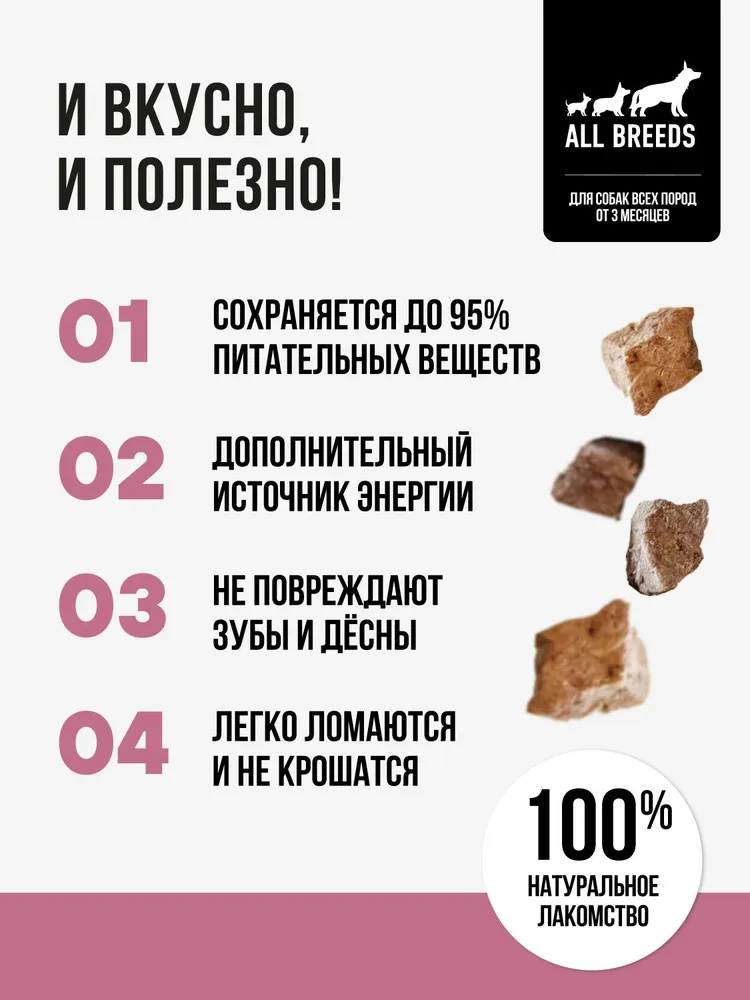 Натуральные лакомства BOWL WOW — полезное угощение!Сублимированные кусочки сохраняют до 95% питательных веществ и служат дополнительным источником животного белка. Благодаря технологии freeze-dry — бережной сушке при низких температурах — продукт сохраняет полезные витамины, аминокислоты и естественный аромат мяса.Нежная текстура и удобный формат идеально подходят для поощрений, дрессировки и питомцев с чувствительным пищеварением. Лакомства легко усваиваются, не перегружают организм и дарят питомцу настоящее удовольствие.Подходят для собак всех пород от 3 месяцев.Не содержит ГМО, красителей, консервантов и усилителей вкуса.BOWL WOW — выбор заботливых хозяев, которые ценят здоровое питание и счастливые моменты со своим любимцем.
