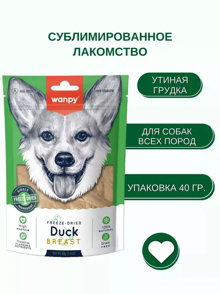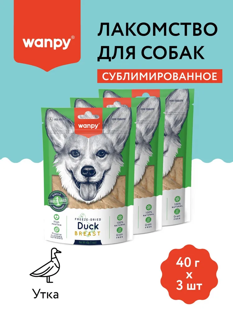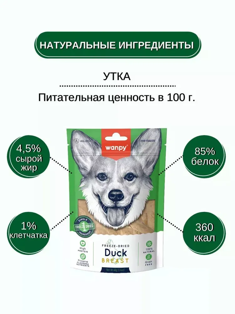 Wanpy Dog сублимированное лакомство для собак "Утка" - это уникальное и полезное угощение, которое сделает день вашего питомца ярче и вкуснее. Лакомство состоит только из одного натурального ингредиента - утки. Благодаря уникальному процессу сублимации, все полезные вещества и витамины сохраняются в продукте, при этом он становится еще более вкусным и ароматным. Питательная ценность лакомства поражает: на 100 г продукта приходится 85% белка, 4,5% жира, 1% клетчатки. Такой состав делает лакомство отличным дополнением к рациону вашей собаки, помогая поддерживать ее активность и здоровье. Сырой жир в составе лакомства помогает поддерживать здоровье кожи и шерсти вашего питомца, а клетчатка способствует нормализации работы желудочно-кишечного тракта. Лакомство Wanpy - это повседневное угощение, которым можно наградить вашего питомца за послушание или просто порадовать его вкусным сюрпризом. Упаковка весом 40 г позволяет удобно дозировать количество лакомства и всегда иметь под рукой свежую порцию.