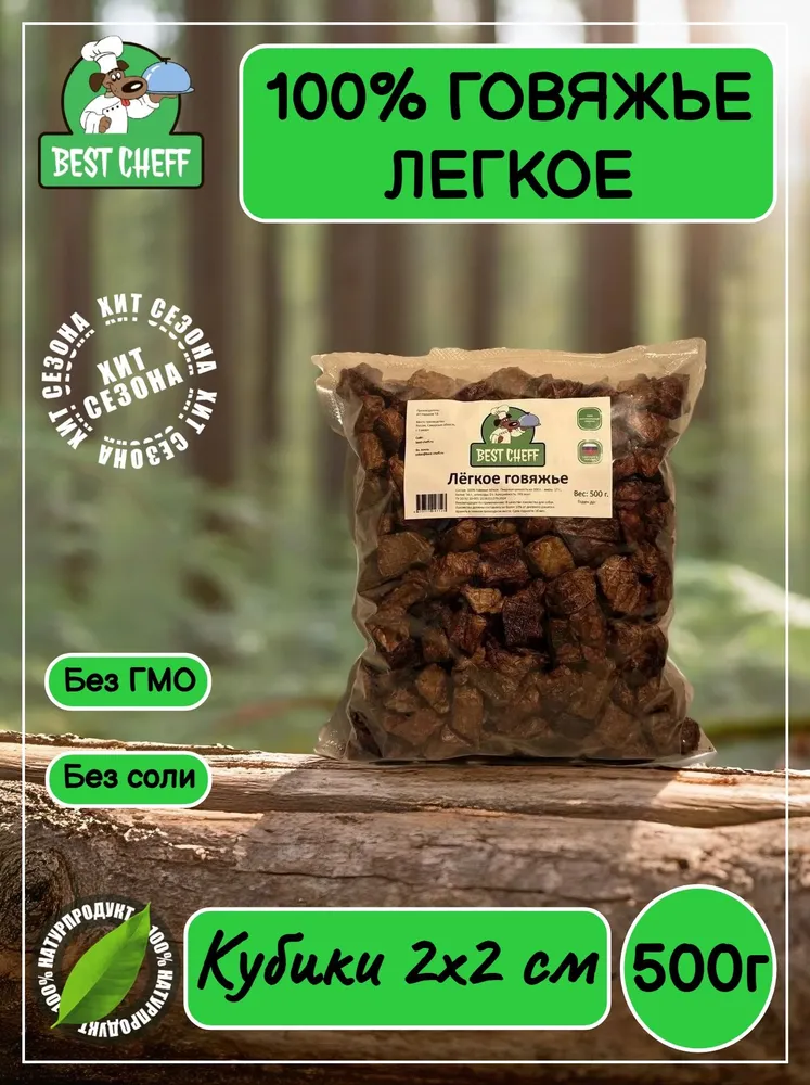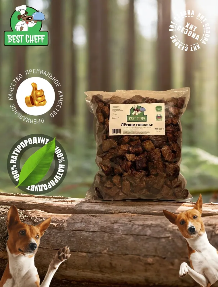 Лакомство "Легкое говяжье" Best Cheff отлично подходит для собак любых размеров и пород.Идеальное лакомство для щенков. Собакам любых пород, начиная с 1,5 месяцев, можно вводить в рацион сушеное говяжье легкое.Лакомство легко режется ножом на более мелкие куски, благодаря чему его можно давать собакам самых маленьких пород и даже кошкам. Да, кошки тоже очень любят это лакомство.Польза сушеного говяжьего легкого