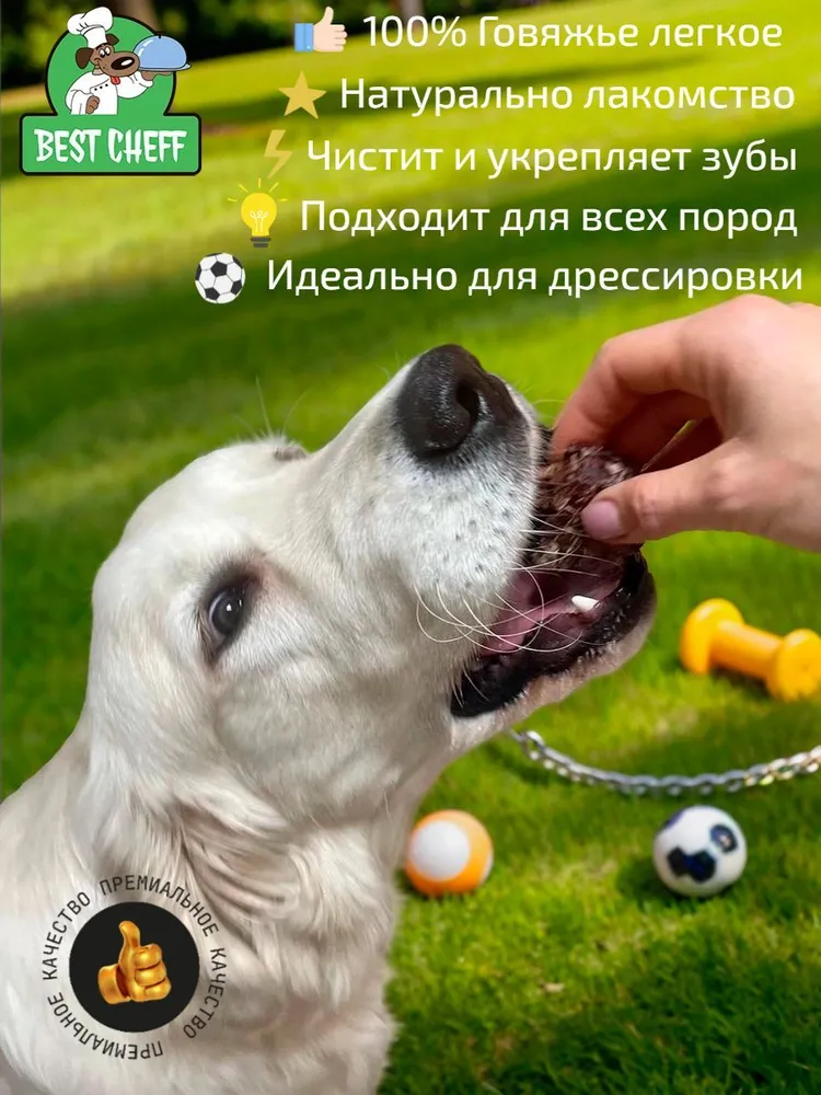Лакомство Best Cheff изготовлено из высококачественного говяжьего лёгкого без добавления каких-либо добавок. Лёгкое говяжье является источником белка, витаминов и микроэлементов, являясь при этом низкокалорийным продуктом. Это лакомство легко усваивается организмом собаки и не вызывает аллергических реакций.Легкое говяжье Best CheffКачество продукции - наш приоритет!Лакомства изготавливаются в России из российского высококачественного свежего сырья. Всё производство от закупки сырья до продаж находится под контролем ФГИС Меркурий. Мы соблюдаем стандарты качества и безопасности при производстве продукции, чтобы вы могли быть уверены в её безопасности для вашего питомца.Состав: 100% легкое говяжье.Срок годности — 18 месяцев.Хранить в темном месте при температуре до +25°C и относительной влажности воздуха не более 70%.Вся продукция сертифицирована.Идеально для поощрения
