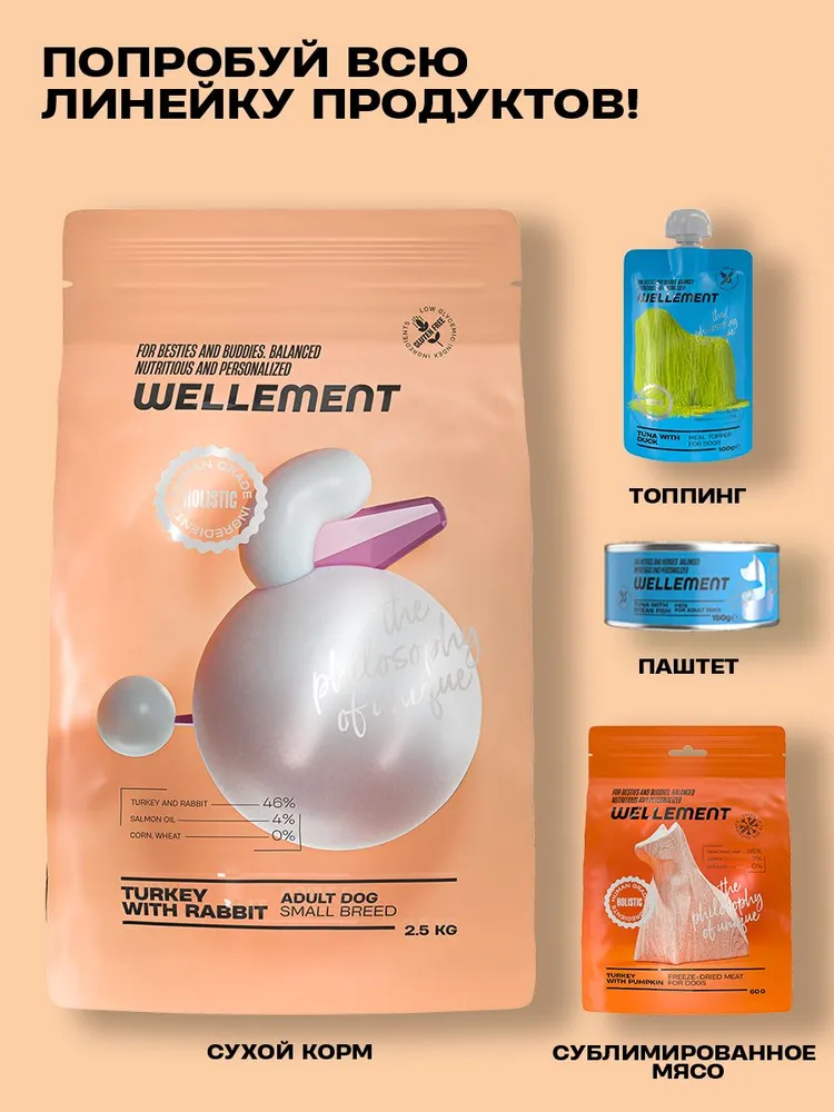 Самое важное — все продукты WELLEMENT можно и нужно смешивать!Следуйте простой инструкции и комбинируйте элементы, чтобы создать уникальную комбинацию – персонализированную систему питания Wellement.Смесь свежего фарша из индейки с яблоками и бурым рисом в форме наггетса подойдет для привередливых собак всех пород и возрастов.Лакомство приготовлено по технологии freeze-dried и сохраняет первоначальные цвет, вкус, аромат, витамины и питательную ценность.Сублимированное мясо – это более 3 вариантов подачи. Его можно давать целиком, крошить сверху на основной корм, ломать кусочками во время тренировки или размочить водой и давать в свежем виде.Низкозерновой сухой корм
