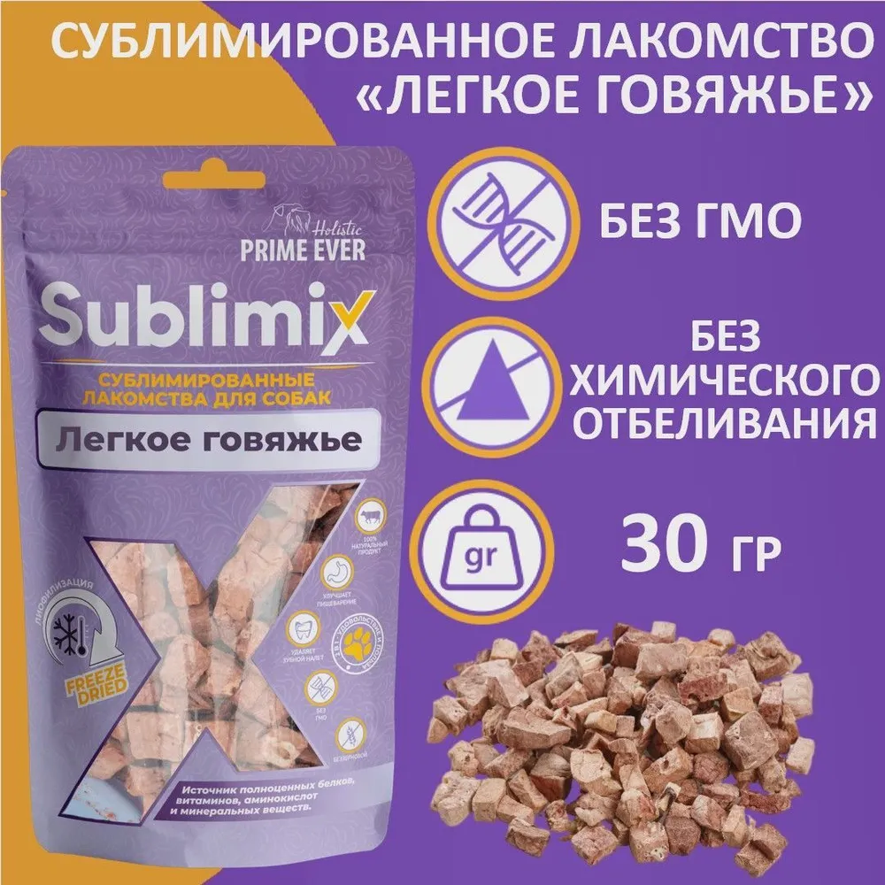 Это инновационные сублимированные лакомства для собак всех пород с 3х месяцев. Легкое нарезано на маленькие кусочки, что делает это лакомство идеальным выбором для использования при дрессировке. Более мягкая структура лакомства, в сравнении с традиционными сушеными лакомствами, позволяет давать их в том числе щенкам, без риска повреждения зубов и десен. При изготовлении применяется современная технология сублимации, которая позволяет сохранить от 94% всех полезных веществ, микроэлементов и витаминов исходного сырья, при этом оставляя неизменными натуральными аромат и вкус продукта.Особенности лакомств Сублимикс:Способствуют бережному очищению зубов от налета.Лакомства изготавливаются из натурального мяса и субпродуктов.Не содержат ГМО.Благоприятно воздействуют на пищеварительную систему животного.Нормы кормления:Лакомства не должны составлять более 10% ежедневного рациона собаки.Также обеспечьте питомцу постоянный доступ к чистой воде.