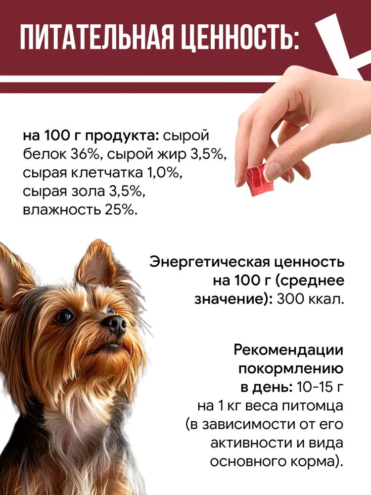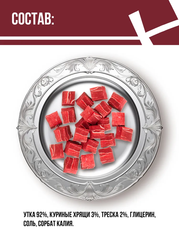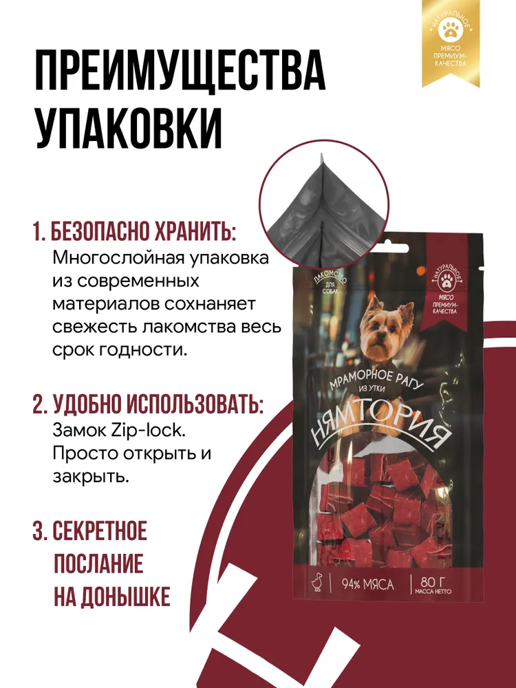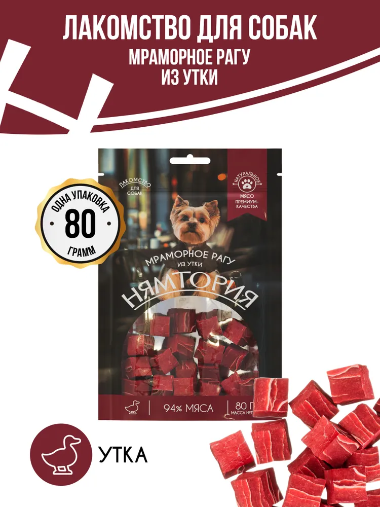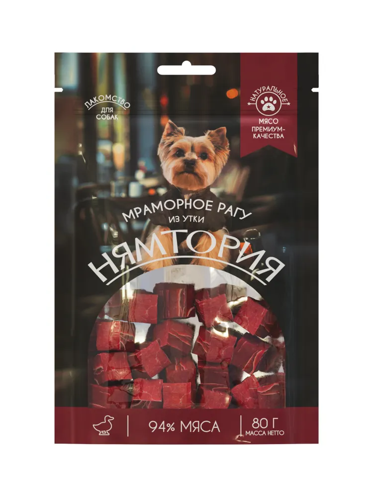 Лакомство для собак "Мраморное рагу из утки" предлагает вашему питомцу теплое, душевное угощение, которое превращает обычный день в праздник. Нежные кусочки утки, тушеные в ароматном соусе с овощами, создают взрыв вкусов, который не оставит равнодушным ни одного собачьего гурмана.- высокое содержание натурального мяса;- аппетитная форма;- качественная упаковка;- подходят для ежедневного использования.Состав:утка 92%, куриные хрящи 3%, треска 2%, глицерин 2,65%, соль 0,25%, сорбат калия 0,1%.Питательная ценность на 100 г:сырой белок 36%, сырой жир 3,5%, сырая клетчатка 1,0%, сырая зола 3,5%, влажность 25%.Рекомендации по кормлению (в день):10-15 г на 1 кг веса питомца (в зависимости от его активности и вида основного корма). У вашего питомца всегда должна быть свежая вода. Продукт является дополнением к основному рациону.Хранить в сухом, защищенном от света месте при температуре от 0 до 25°С, относительной влажности воздуха не более 70%. После вскрытия хранить не более 14 дней в плотно закрытой упаковке.Срок годности: 24 месяца.