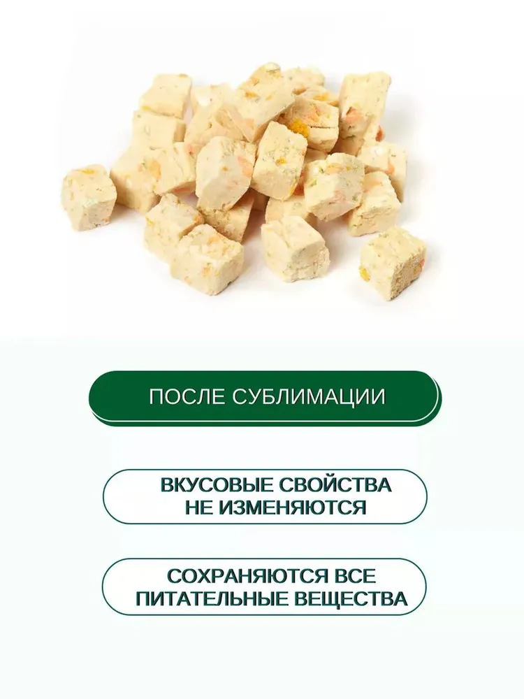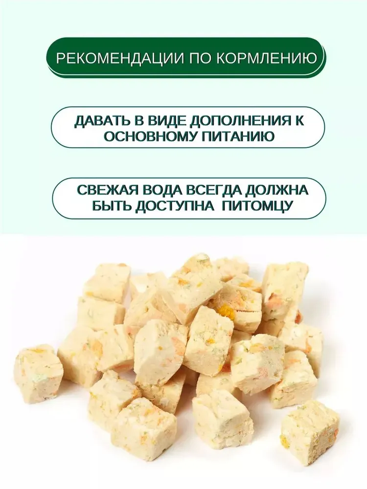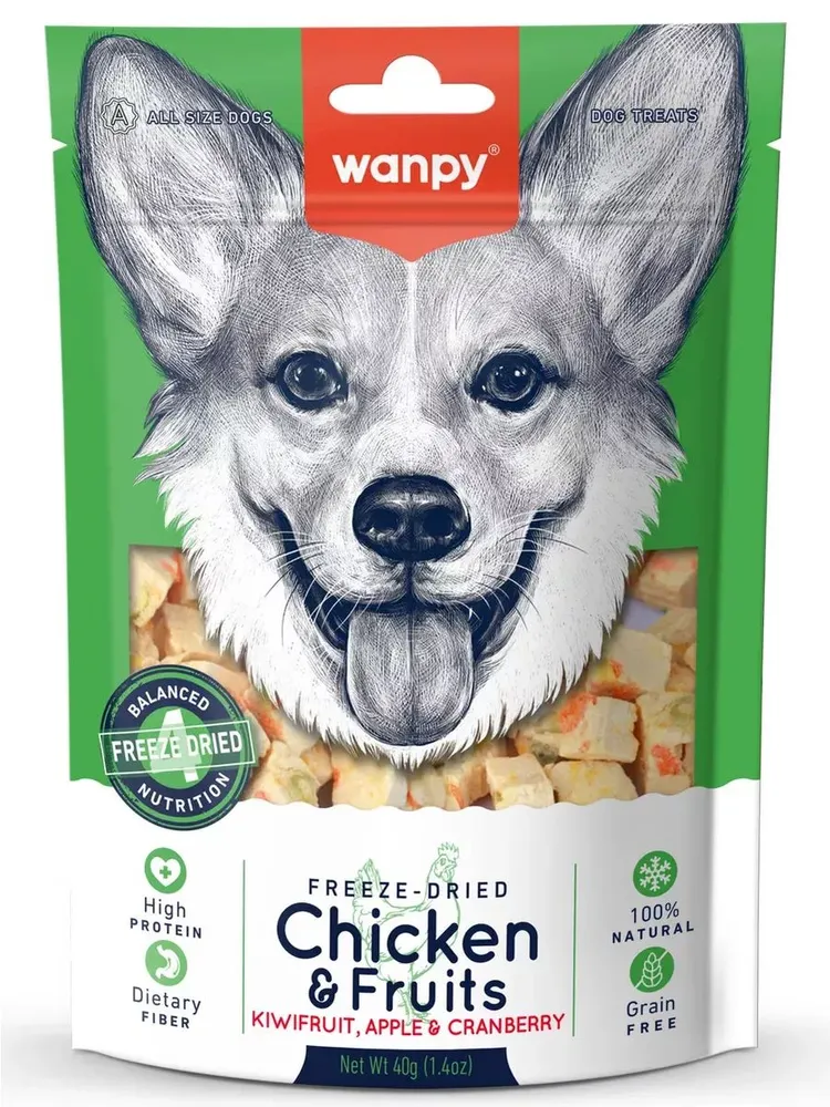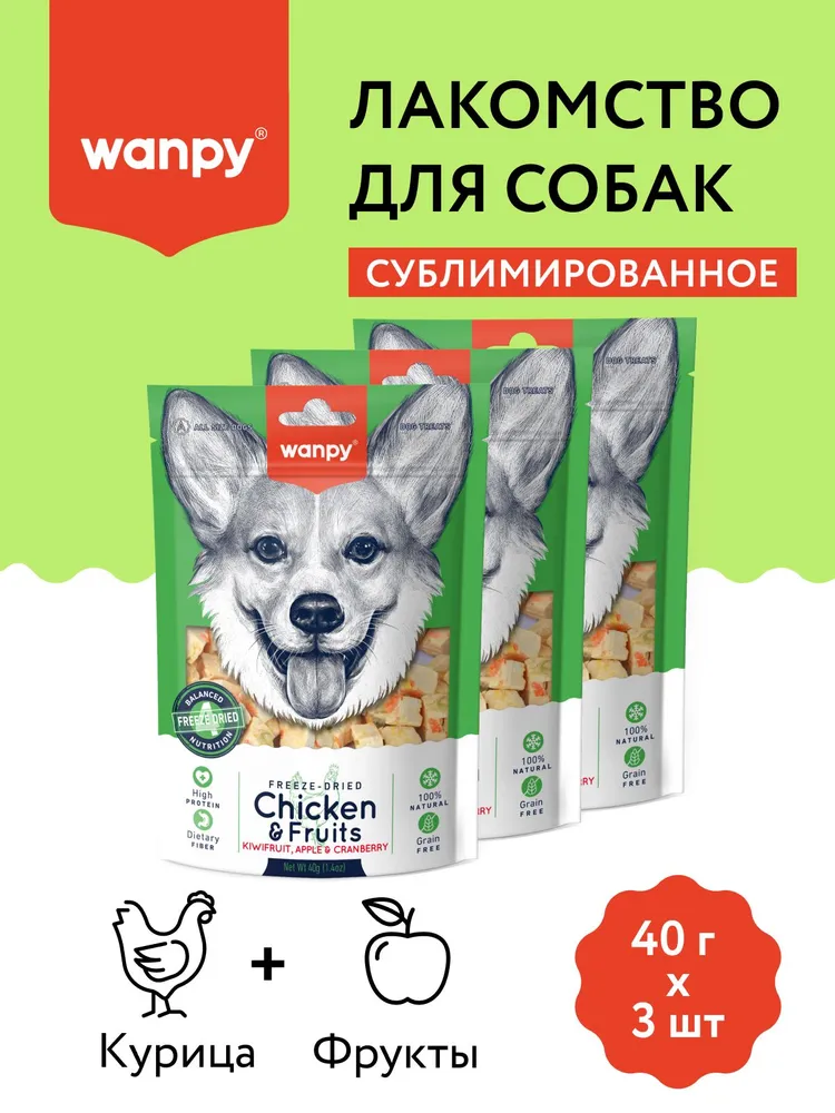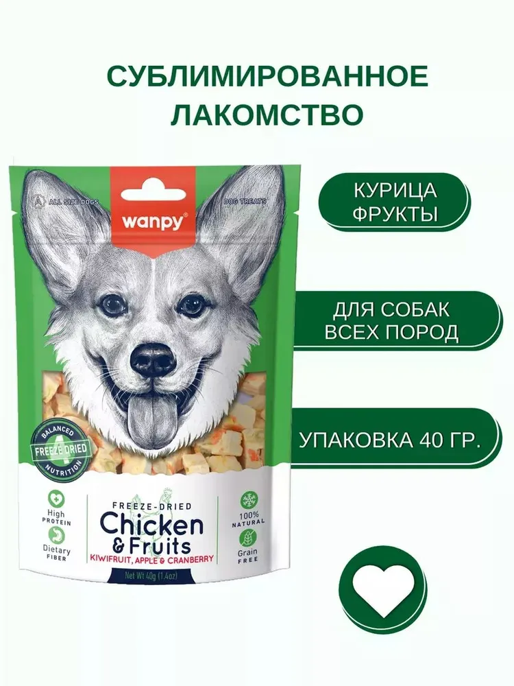 Wanpy Dog сублимированное лакомство для собак "Курица и фрукты" - это уникальное и полезное угощение, которое сделает день вашего питомца ярче и вкуснее. Лакомство состоит из натуральных ингредиентов - курицы, киви, яблока и клюквы. Благодаря специальному процессу сублимации, все полезные вещества и витамины сохраняются в продукте, при этом он становится еще более вкусным и ароматным. Питательная ценность лакомства впечатляет: на 100 г продукта приходится 56% белка, 8,5% жира, 1% клетчатки. Такой состав делает лакомство идеальным дополнением к рациону вашей собаки, помогая поддерживать ее активность и здоровье. Сырой жир в составе лакомства помогает поддерживать здоровье кожи и шерсти вашего питомца, а клетчатка способствует нормализации работы желудочно-кишечного тракта. Лакомство Wanpy - это повседневное угощение, которым можно наградить вашего питомца за послушание или просто порадовать его вкусным сюрпризом. Упаковка весом 40 г позволяет удобно дозировать количество лакомства и всегда иметь под рукой свежую порцию.