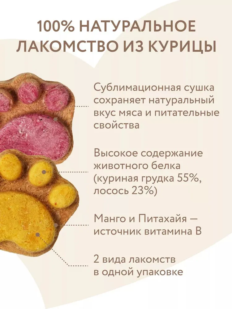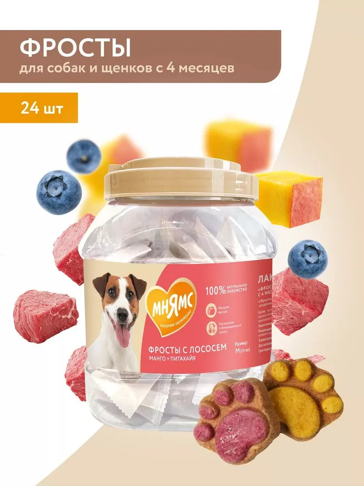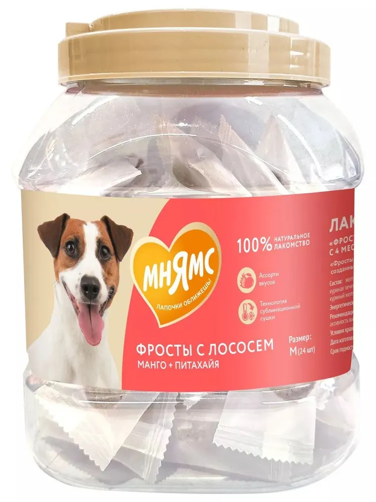 "Мнямс" Лакомство "Фросты" с лососем для собак и щенков с 4 месяцев - это сублимированные беззерновые лакомства с высоким содержанием животного белка (куриная грудка 55%, лосось 23%), созданные при помощи прогрессивной технологии сушки, которая сохраняет натуральный вкус мяса и питательные свойства ингредиентов. Манго и питахайя в составе являются источниками витаминов группы В, необходимых для укрепления иммунитета питомца.Одна упаковка "Фростов" содержит лакомства двух видов: с лососем и манго и с лососем и питахайей, которые подходят для питомцев всех пород.Для собак разного веса предусмотрены различные нормы потребления: от 1 фроста в день для собак весом <5кг до >5 фростов в день для собак весом более 25 кг.Размер М, в упаковке 24 штуки.Лакомство "Фросты" с лососем для собак и щенков с 4 месяцев очень вкусное и не оставит равнодушным даже самого привередливого любимца!