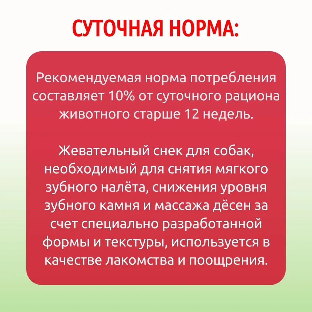 Профилактическое лакомство жевательный снек DENT со вкусом говядины для собак мини пород - это жевательный снек для собак, необходимый для снятия мягкого зубного налёта, снижения уровня зубного камня и массажа дёсен за счет специально разработанной формы и текстуры, используется в качестве лакомства и поощрения.