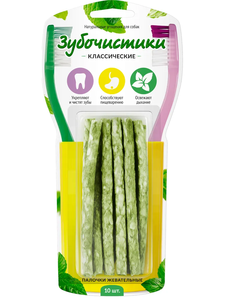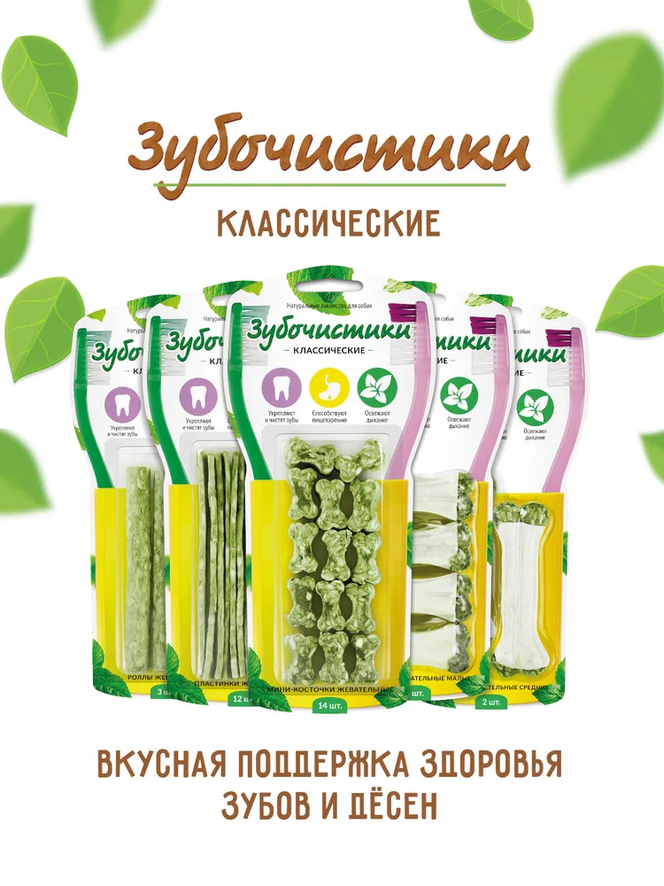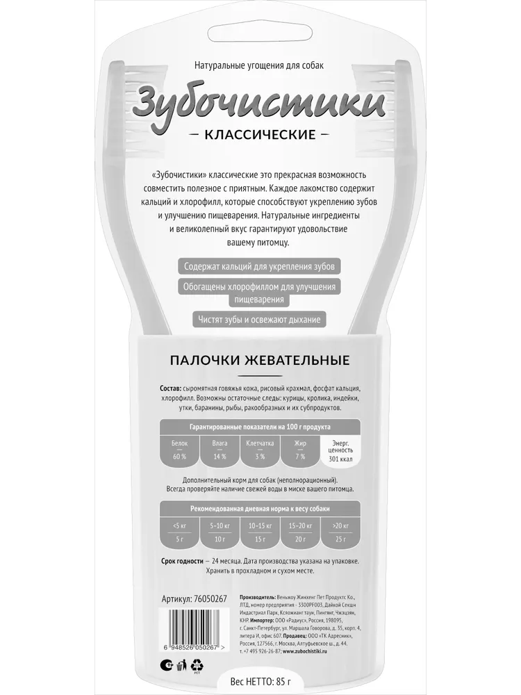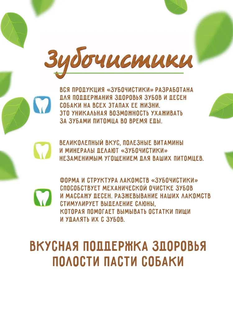 По статистике, 4 из 5 собак в возрасте старше 3 лет страдают от заболеваний зубов и десен. Продукция торговой марки «Зубочистики» разработана для поддержания здоровья зубов собаки на всех этапах ее жизни.Форма и структура лакомств «Зубочистики» способствует механической очистке зубов и массажу десен. Разжевывание наших лакомств стимулирует выделение слюны, которая помогает вымывать остатки пищи и удалять их с зубов.«Зубочистики» классические — это прекрасная возможность совместить приятное с полезным. Каждое лакомство содержит кальций и хлорофилл, которые способствуют укреплению зубов и улучшению пищеварения. Натуральные ингредиенты и великолепный вкус гарантируют удовольствие вашему питомцу.Жевательные косточки, специально обернутые натуральной кожей, предназначены для долгого жевания.Состав: сыромятная говяжья кожа, рисовый крахмал, фосфат кальция, хлорофилл. Возможны остаточные следы: говядины, курицы, кролика, индейки, утки, баранины, рыбы, ракообразных и их субпродуктов.Гарантированные показатели на 100 гр. продукта: белок - 60%, влага - 14%, клетчатка - 3%, жир - 7%.Энергетическая ценность: 301 ккал.Товар сертифицирован.