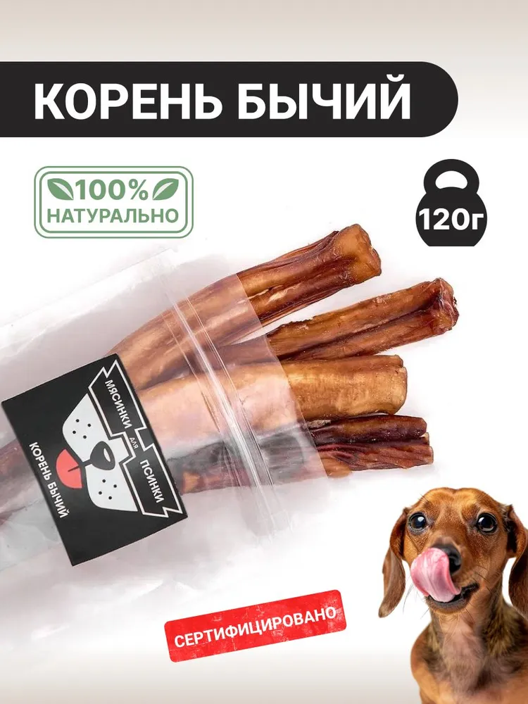 Натуральное низкокалорийное лакомство для собак крупных, средних и мелких пород, с высоким содержанием белка, аминокислот и микроэлементов. Самое долгоиграющее лакомство из всех мясных вкусняшек бренда «МЯСИНКИ ДЛЯ ПСИНКИ», такие как легкое говяжье, трахея говяжья, рубец говяжий, кишки говяжьи, аорта говяжья, пребиотики и пробиотики. лучше любой игрушки на долго займет и успокоит вашего питомца, удовлетворит его потребность что-либо погрызть, оберегая ваши мебель и нервы. Отлично усваивается и при умеренном потреблении не ведет к проблемам с пищеварением. Включение в рацион взрослых собак и щенков с 3-х месяцев способствует укреплению их десен и чистке зубов, улучшению состояния суставов когтей и шерсти, укреплению иммунной системы. Как и все настоящие деревенские эко лакомства, корень готовится исключительно из натурального сырья, прошедшего обязательный ветеринарный контроль, без добавок, консервантов и усилителей вкуса. Бережная сушка сохраняет всю пользу входящего сырья для здоровья собаки. Нарезан на порционные кусочки, а удобная многоразовая упаковка позволяет легко хранить и брать любимые погрызушки с собой на прогулку и в поездки. Товар сертифицирован. Корень сушеный хорошая альтернатива: ушкам свиным, уши кролика, косточки, кость, палочки для щенков, колбаски, ушки зайца, печенье, жила говяжья, копыто и ноги козьи, вымя коровье, рог олений, нос, хрящи, пятачки, рог бараний, сухожилия шейка, индейка все эти погрызушки сушеные отлично очищают зубы от налета собакам и котам, так же как палочки для чистки зубов и зубочистки жевательные. Такое лакомство как, вяленые мясо, натуральные чипсы для собак аорта, шарфик утиный, хвост куриный, семенники, можно включать к сухому и влажному корму для разнообразия, дополнение витаминами и минералами дневной рацион собак. Эти низкокалорийные, гипоаллергенные, диетические хрустики надолго отвлечет и порадует вашего питомца.\n\nВАЖНО!!! Мы не используем добавки при производстве наших продуктов, из-за чего они имеют специфический запах, иногда резкий для человека, но притягательный для собак.