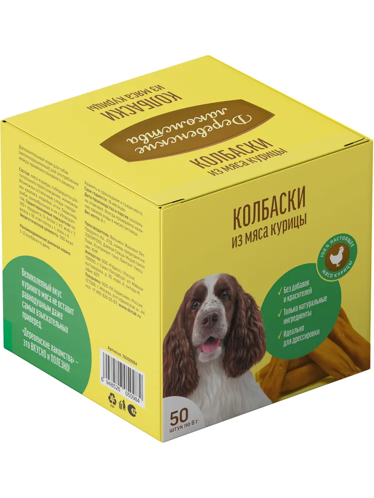 В основе «Деревенских лакомств» лежат традиции поощрения домашних питомцев, совмещенные с современными знаниями в области ветеринарии и здорового питания животных.Натуральные лакомства для собак изготовлены с учетом сбалансированного питания из качественных, безопасных и тщательно подобранных ингредиентов. Идеальные для дрессуры и поощрения "Деревенские лакомства" отбираются и обрабатываются вручную и могут служить эталоном лакомств для домашних животных."Деревенские лакомства" Мини-колбаски - это нежные мясные колбаски с восхитительным запахом настоящего мяса. Каждая колбаска упакована в индивидуальную герметичную обертку. Такая упаковка очень удобна, ведь в данном случае вы можете использовать угощение для поощрения животного так часто, как это необходимо именно вам, и не бояться, что оставшиеся в открытом пакете лакомства потеряют свои свойства. Колбаски останутся свежими, сочными, очень вкусными и полезными не протяжении всего срока годности. "Деревенские лакомства" Мини-колбаски имеют очень нежную консистенцию и восхитительный мясной вкус и запах, перед которым не устоит ни один привереда.Состав: мясо курицы, субпродукты растительного происхождения, минералы. Пищевая ценность, %: белки — 42, жиры — 7, клетчатка — 1, зола — 4, влажность — 18.Энергетическая ценность: 300 ккал / 100 г. Товар сертифицирован.