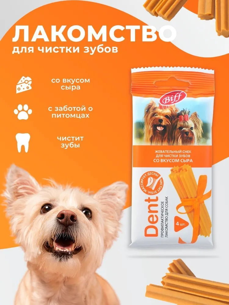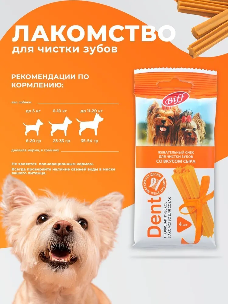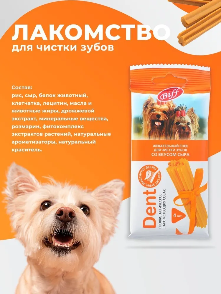Biff DENT жевательные снеки - это профилактическое лакомство для собак, которое благодаря специально разработанной форме и текстуре, учитывает все особенности мелких пород. Рекомендованы для снятия мягкого зубного налета.Состав: рис, сыр, белок животный, клетчатка, лецитин, масла и животные жиры, дрожжевой экстракт, минеральные вещества, розмарин, фитокомплекс экстрактов растений, натуральные ароматизаторы, натуральный краситель.Пищевая ценность в 100 г: белки 7 г, жиры 2,5 г, зола 2,5 г, клетчатка 2 г, влага 20 г. Энергетическая ценность на 100 г: 230 ккал.СОСТАВЛЯЮЩИЕ ЛУЧШЕГО ЛАКОМСТВА:НАТУРАЛЬНОЕ МЯСО100% натуральная птица, говядина и рыба, выращенные на Российских фермерских хозяйствах