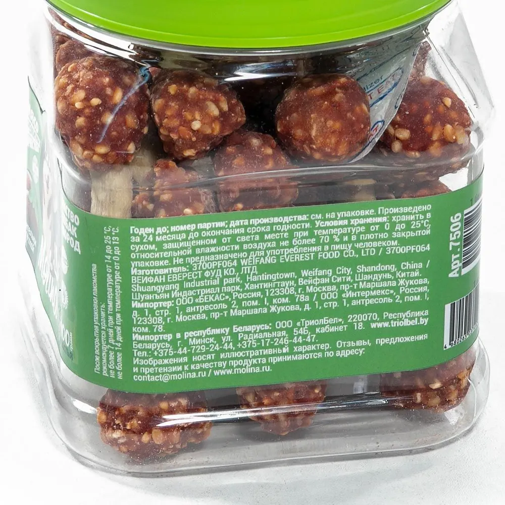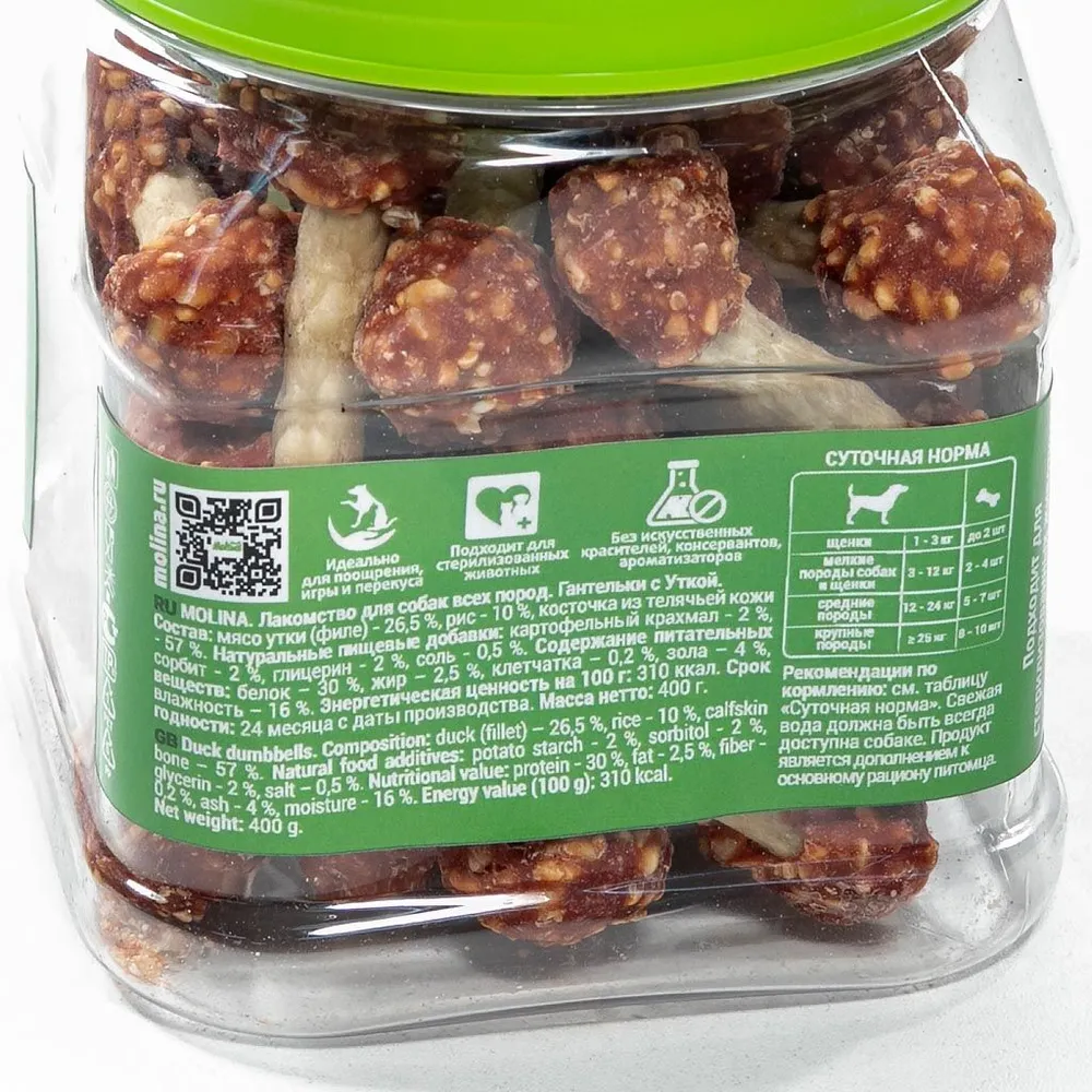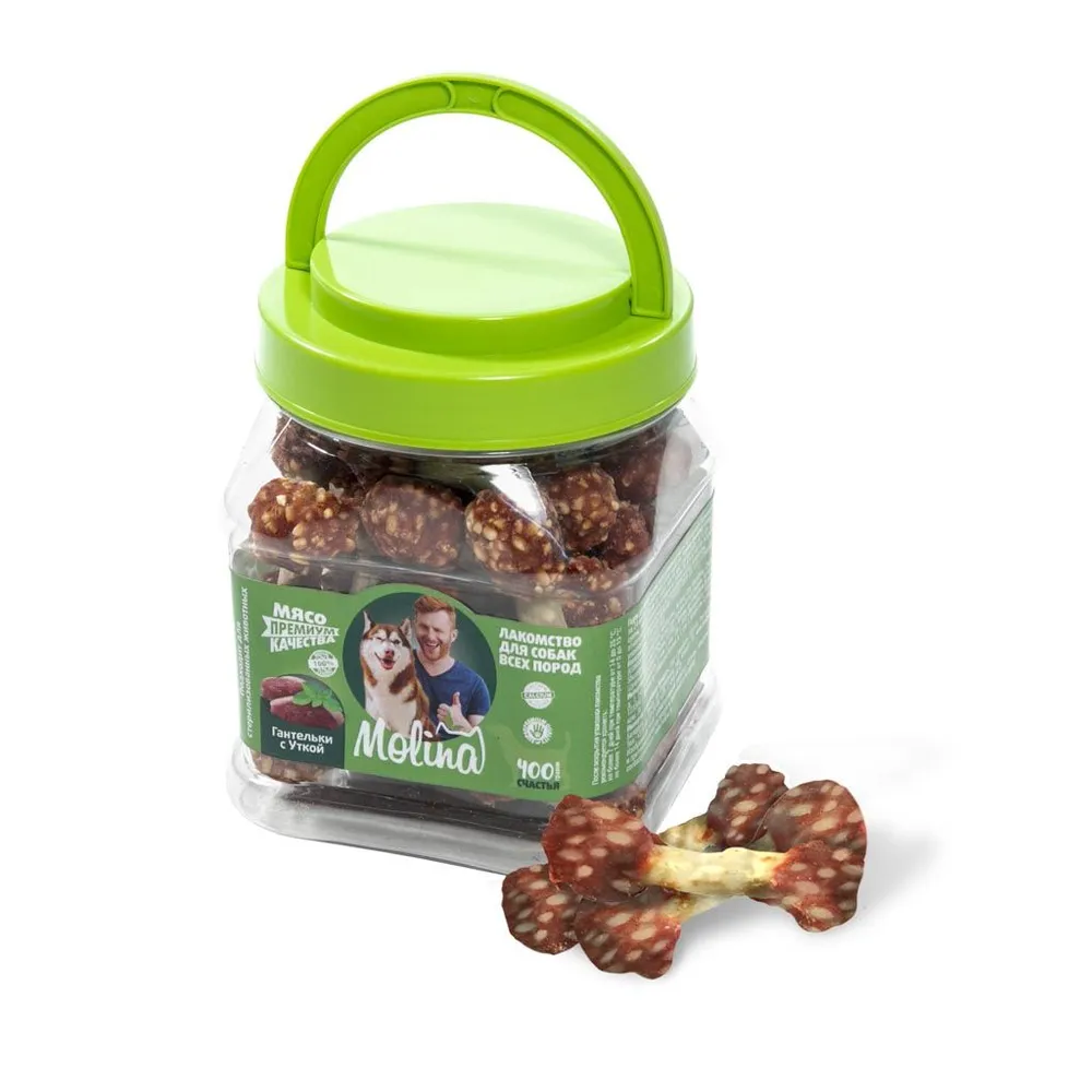 Вяленое мясо утки и полезная косточка в виде гантелек непременно понравятся вашему питомцу. Лакомство содержит кальций — необходимый для профилактики кариеса и укрепления зубной эмали и костей собаки. Натуральный и вкусный продукт, без искусственных добавок, красителей, ГМО и усилителей вкуса, идеален для поощрения, игры, перекуса и дрессур. Суточная норма кормления: щенки 1-3 кг — до 2 шт, мелкие породы 3-12 кг — 2-4 шт, средние породы 12-24 кг — 5-7 шт, крупные породы более 25 кг — 8-10 шт (в зависимости от активности питомца и типа основного питания). В упаковке 24±1 шт.