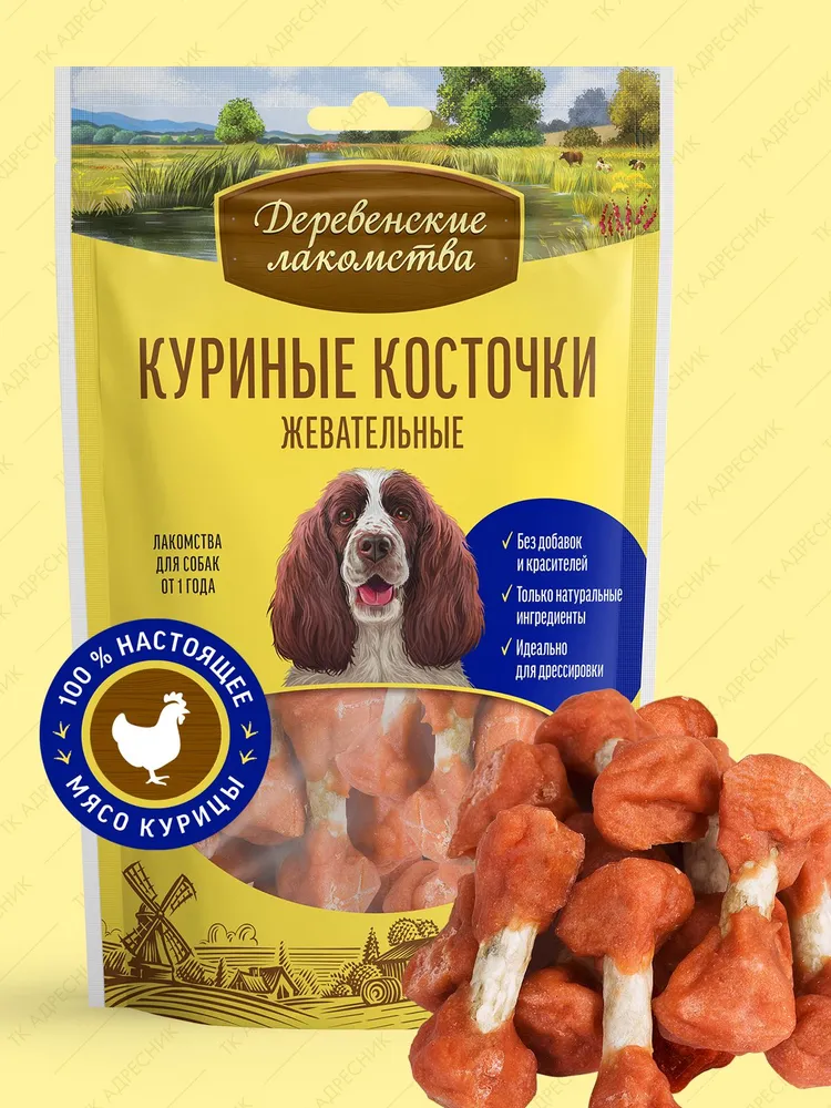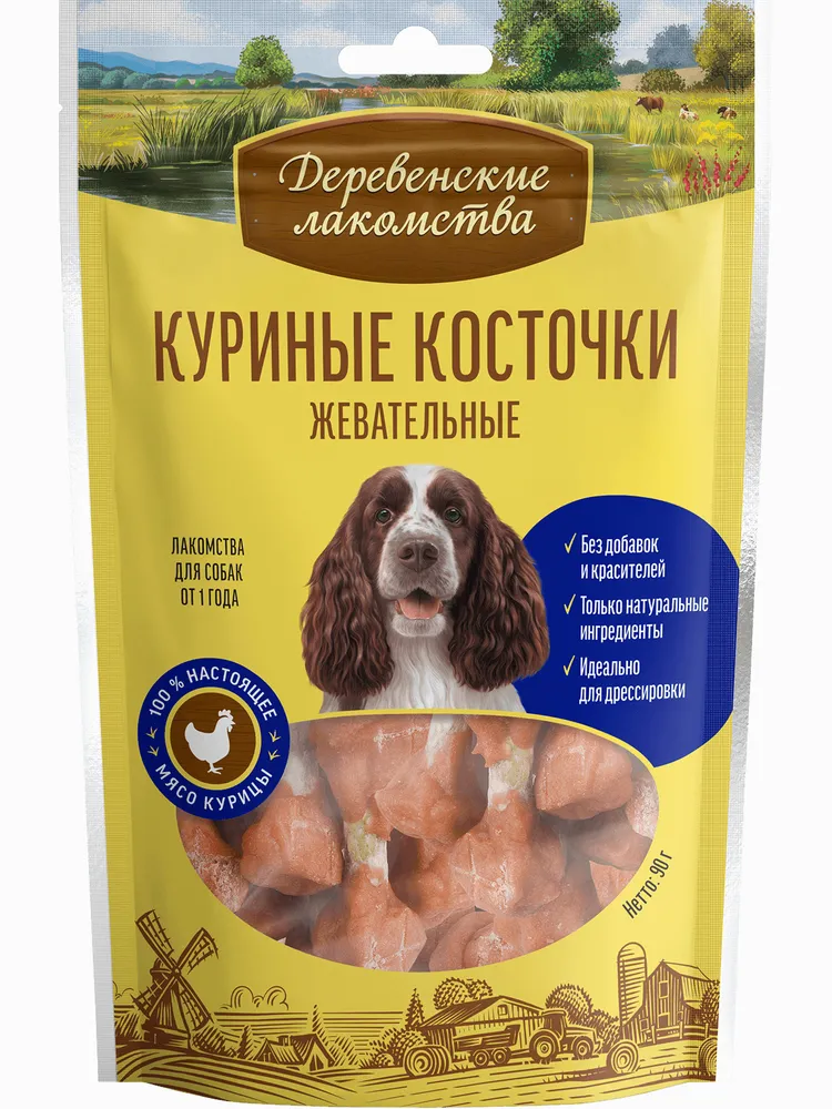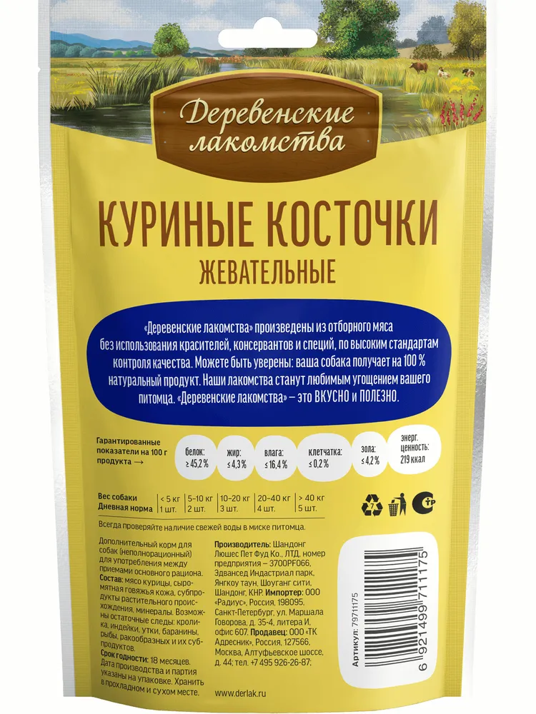В основе «Деревенских лакомств» лежат традиции поощрения домашних питомцев, совмещенные с современными знаниями в области ветеринарии и здорового питания животных. Натуральные лакомства для собак изготовлены с учетом сбалансированного питания из качественных, безопасных и тщательно подобранных ингредиентов. Идеальные для дрессуры и поощрения "Деревенские лакомства" отбираются и обрабатываются вручную и могут служить эталоном лакомств для домашних животных. Наверное, так собаки представляют себе идеальное лакомство. Сушёное куриное мясо на мягкой жевательной палочке станет обязательным пунктом в списке ваших покупок. Состав: мясо курицы, сыромятная говяжья кожа, субпродукты растительного происхождения, минералы. Пищевая ценность, %: белки — 45. 2, жиры — 4. 3, клетчатка — 0. 2, зола — 4. 2, влажность — 16. 4. Энергетическая ценность: 219 ккал. Товар сертифицирован.