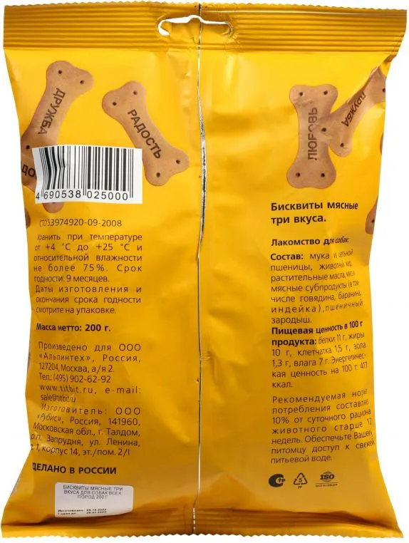 Почувствовать заботу и любовь Вашему питомцу поможет изысканное лакомство - Печенье для собак Бисквиты мясные. Угощение, созданное на основе натуральных ингредиентов, с добавлением яблок и трёх видов мяса (утки, говядины и баранины) и приготовленное по уникальной рецептуре и технологии TiTBiT. Состав: мука из цельной пшеницы, животный жир, растительные масла, мясо и мясные субпродукты (в том числе говядина, баранина, индейка), пшеничный зародыш. Пищевая ценность в 100 г: белки 11 г, жиры 10 г, клетчатка 1,5 г, зола 1,3 г, влага 7 г. Энергетическая ценность на 100 г: 417 ккал. Срок годности (мес) - 9 Условия хранения Хранить при температуре от +4?С до +25?С и относительной влажности не более 75%.