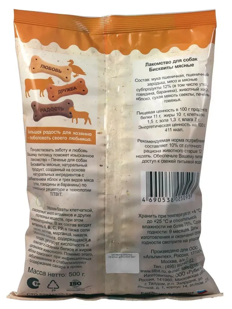 Мясные бисквиты от Titbit — это неотъемлемая часть рациона, особенно когда речь идет о дрессировке. Наши мясные бисквиты — идеальный выбор для поощрения вашего питомца. Они изготовлены из высококачественных ингредиентов, что делает их не только вкусными, но и полезными для здоровья собак. \n\nЭти лакомства разработаны с учетом потребностей собак всех пород и возрастов, включая щенков. Бисквиты содержат натуральное мясо, что обеспечивает высокую питательную ценность и способствует поддержанию энергии и активности вашего питомца. Печенье имеет оптимальную текстуру: оно достаточно сухое, чтобы сохранить свежесть, но при этом легко разжевывается, что делает его идеальным для использования в процессе дрессировки.\n\nПродукт бренда Titbit — это гарантия качества и безопасности. Лакомства Titbit известны своим сбалансированным составом и высоким содержанием белка, что особенно важно для активных собак. Печень, входящая в состав бисквитов, богата витаминами и минералами, необходимыми для поддержания здоровья собаки.\n\nПеченьки подходят для ежедневного использования и могут стать отличным дополнением к основному рациону. Они не содержат искусственных добавок и консервантов, что делает их безопасными для вашего питомца. Используйте эти лакомства для собак как мотивацию во время дрессировки, и вы заметите, как быстро ваш питомец усваивает новые команды.\n\nВключение таких лакомств в рацион способствует улучшению пищеварения и укреплению иммунной системы. Мясное печенье Titbit — это не просто угощение, а полноценный элемент заботы о вашем четвероногом друге. Выбирая наши бисквиты, вы обеспечиваете своему питомцу вкусное и полезное поощрение.