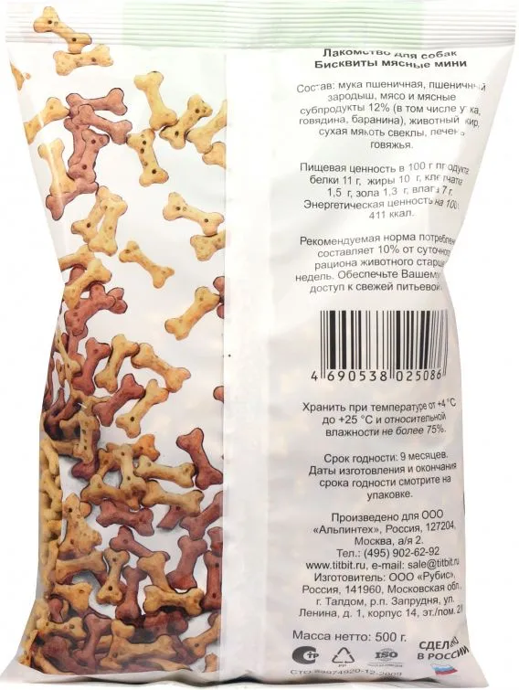 Почувствовать заботу и любовь Вашему питомцу поможет изысканное лакомство - Печенье для собак Бисквиты мясные мини. Угощение, созданное на основе натуральных ингредиентов, с добавлением трёх видов мяса (утки, говядины и баранины) и приготовленное по уникальной рецептуре и технологии TiTBiT. Состав: мука пшеничная, пшеничный зародыш, мясо и мясные субпродукты 12% (в том числе утка, говядина, баранина), животный жир, сухая мякоть свеклы, печень говяжья. Пищевая ценность в 100 г: белки 11 г, жиры 10 г, клетчатка 1,5 г, зола 1,3 г, влага 7 г. Энергетическая ценность на 100 г: 411 ккал. Срок годности (мес) - 9 Условия хранения Хранить при температуре от +4?С до +25?С и относительной влажности не более 75%.