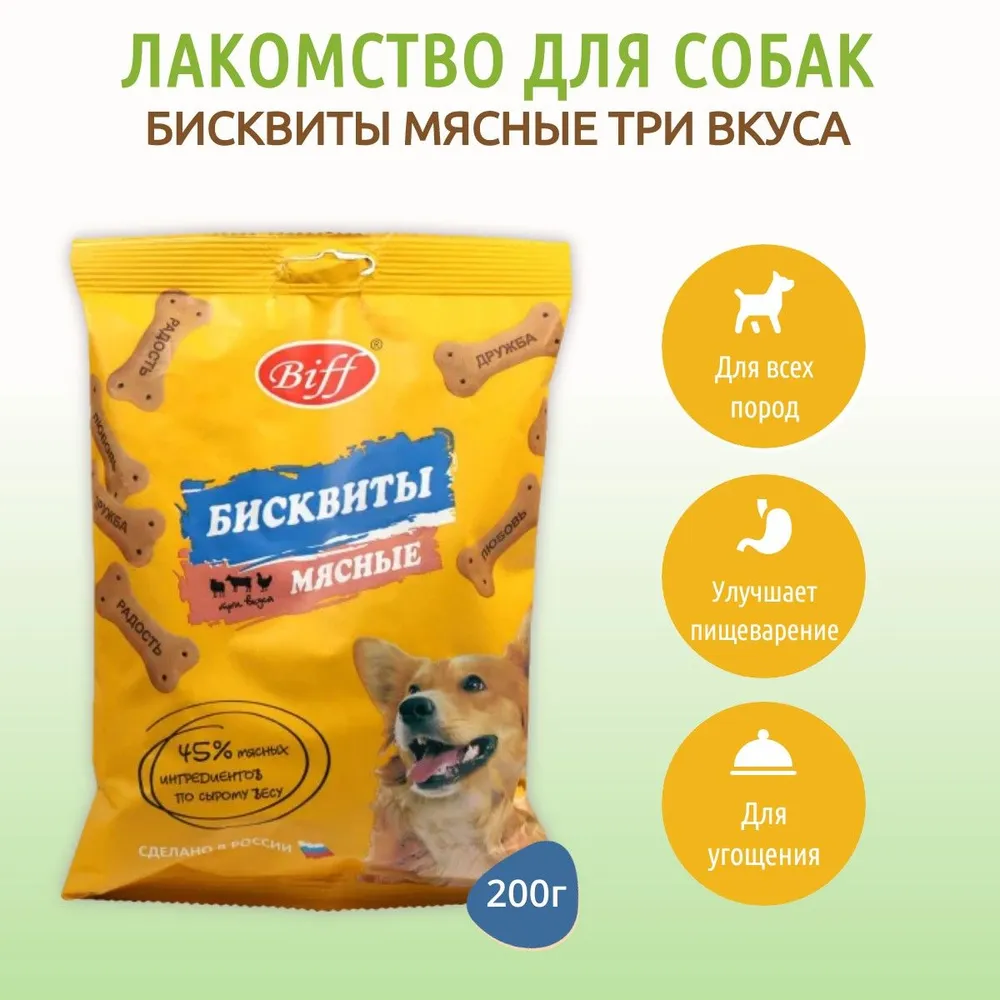 Почувствовать заботу и любовь Вашему питомцу поможет изысканное лакомство - Печенье для собак Бисквиты мясные Три вкуса. Угощение, созданное на основе натуральных ингредиентов, с добавлением трёх видов мяса (утки, говядины и баранины).