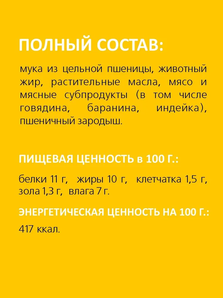 Почувствовать заботу и любовь Вашему питомцу поможет Мясная выпечка от Biff - угощение, разработанное специально для собак.Три разных вкуса в одной упаковке: утка, говядина и баранина, позволят угодить даже самым привередливым питомцам. Вкусняшка отлично подходит для дрессировки, поощрения и совместных игр. Печенье не пачкает руки.Лакомства – это дополнительное питание, не заменяющее ежедневное полноценное кормление. Пожалуйста, оставляйте питомцу миску со свежей питьевой водой.Лакомства компании Biff производятся только в России, из высококачественного сырья, поставляемого Российскими фермерскими хозяйствами. Производство сертифицировано по международным стандартам HACCP ISO 22000:2005 в области безопасности пищевой продукции.