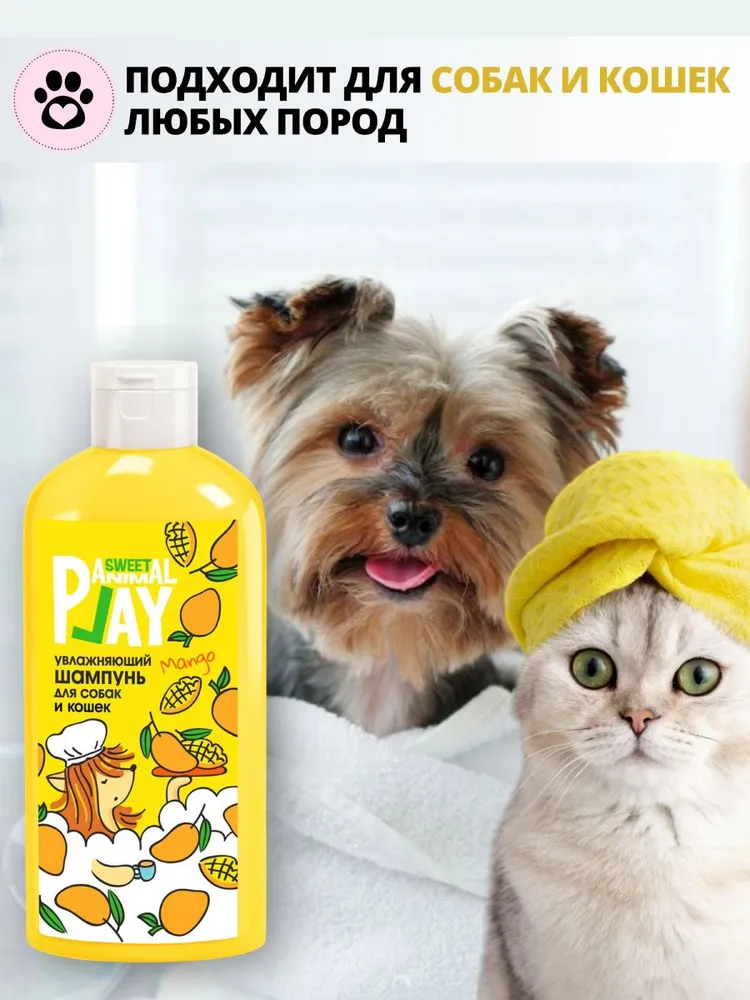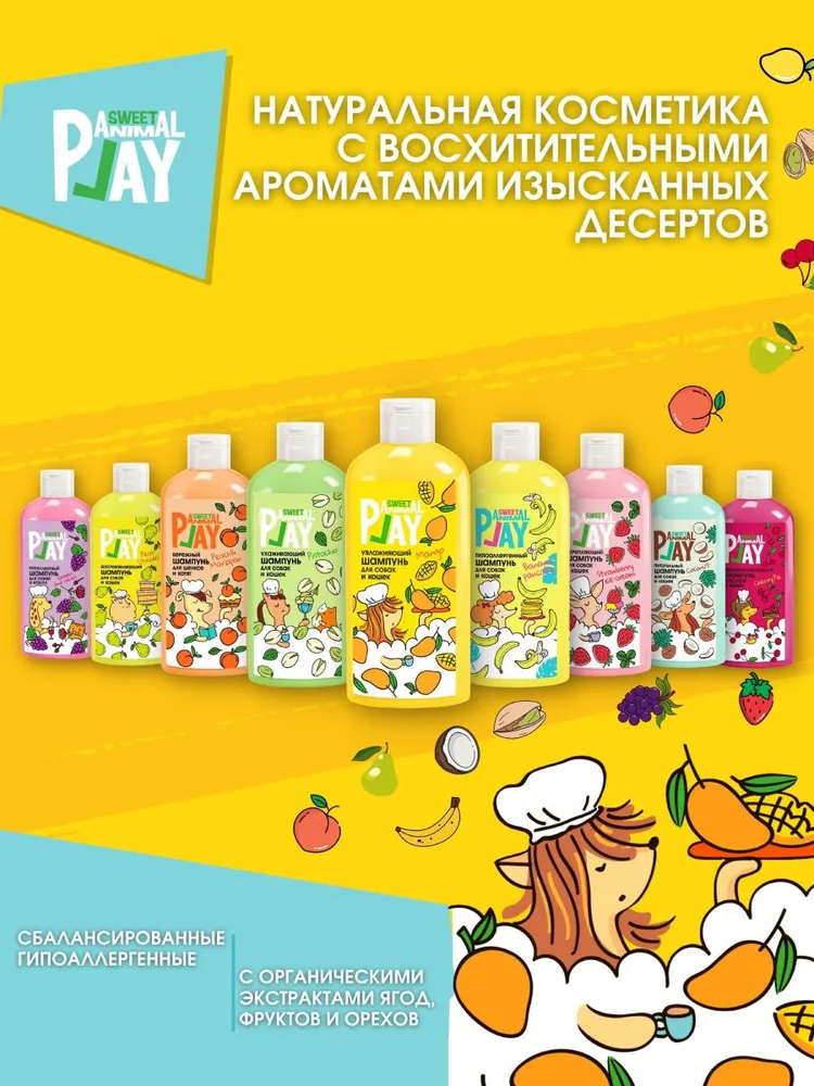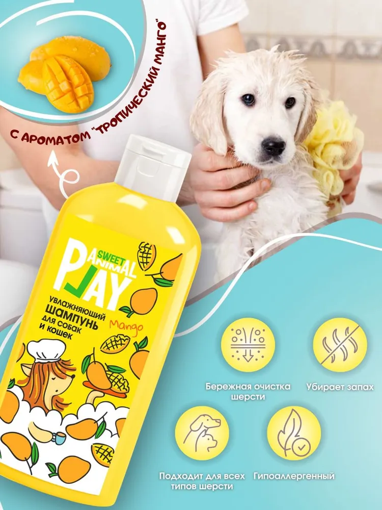 Товары для кошек и собак невозможно представить без Animal Play Sweet шампунь для собак и кошек, входящий в категорию груминг и уход, с ярким, но не резким ароматом, который нравится многим покупателям и не доставит дискомфорт питомцам.У шампуней для животных Animal Play есть следующие преимущества: гипоаллергенные формулы, благодаря которым шампунь для собак и кошек подходит всем питомцам. Экстракты ягод, фруктов и орехов питают и увлажняют кожу и шерсть животного. Шампуни подходят для ежедневного применения и являются незаменимым товаром для животных. Увлажняющий шампунь для кошек и собак с солнечным ароматом тропического манго эффективно промывает шерсть и очищает кожу питомца. Органический экстракт манго интенсивно насыщает витаминами и увлажняет шерсть, защищает от ломкости, придает блеск и яркость естественному окрасу. Бетаин успокаивает и смягчает кожу, защищает от перхоти, снимает покраснения.