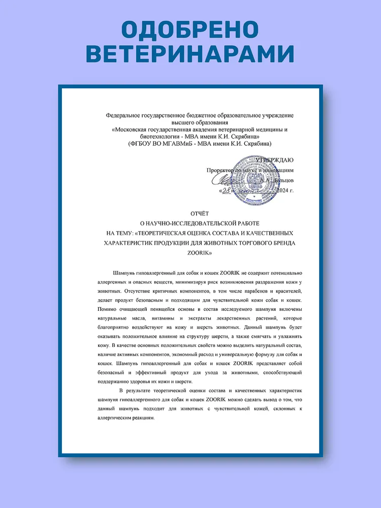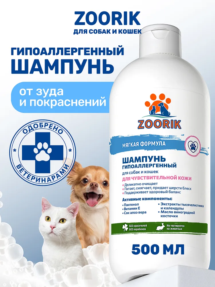 Идеальный выбор для бережного ухода за питомцами с чувствительной кожей. Гипоаллергенный шампунь ZOORIK создан на основе натуральных компонентов, чтобы деликатно очищать шерсть и не вызывать раздражений. Подходит для всех пород, включая животных с склонностью к аллергическим реакциям и сухости кожи.Сбалансированный состав сочетает растительные экстракты, масла и увлажняющие вещества. Сок алоэ вера глубоко питает, удерживает влагу, восстанавливает повреждённые участки. Экстракт календулы смягчает, снимает покраснения, способствует заживлению. Тысячелистник активизирует рост и укрепляет волосяные луковицы.Масло виноградной косточки делает шерсть гладкой и блестящей, возвращает эластичность. Витамин Е и пантенол защищают от пересушивания, насыщают полезными элементами, укрепляют структуру, придавая ухоженный вид. Кондиционирующий компонент облегчает расчёсывание, предотвращая образование колтунов.После применения шерсть становится мягкой, послушной и шелковистой, кожа — спокойной и увлажнённой. Шампунь подходит для частого использования, помогает сохранить здоровье, комфорт и чистоту вашего питомца без риска для его чувствительности.СПОСОБ ПРИМЕНЕНИЯ: обильно смочить шерсть теплой водой. Развести шампунь с теплой водой в пропорции 1/3, с помощью губки равномерно нанести на влажную шерсть, слегка втирая до образования пены. Тщательно смыть теплой проточной водой. Высушить питомца полотенцем и расчесать.E-COSMETIC – официальный поставщик ZOORIK.