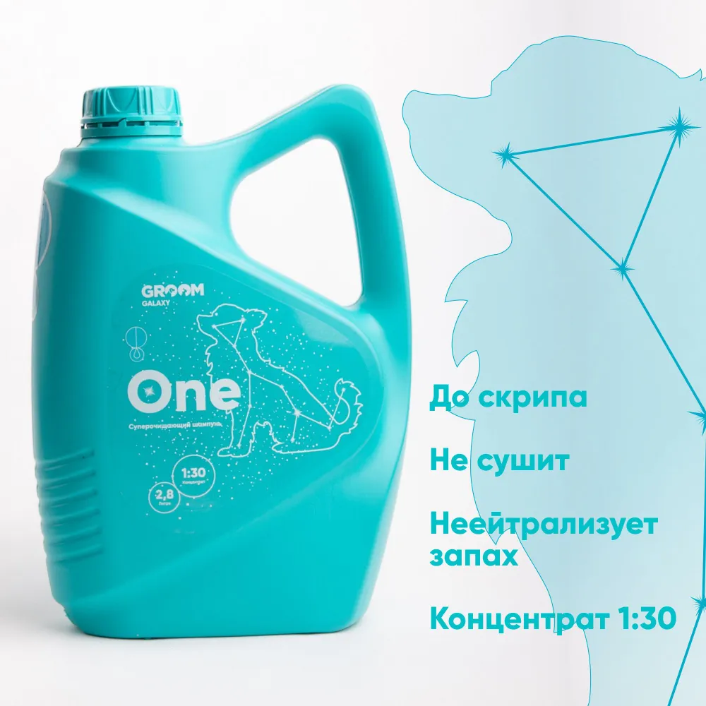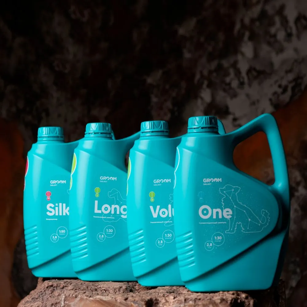 Cистема мытья GROOM GALAXYИнновационная профессиональная система ухода за кожей и шерстью мелких домашних животных.Супер-концентрат 1:30-1:50. Набора косметики хватит на 280 груминг-услуг*1. Суперочищающий шампунь ONE - первый этап мытья системы Groom Galaxy.Нацелен максимально очистить кожу и шерсть собаки «до скрипа» без вреда для структуры волоса и кожи. Не сушит кожу. Подходит для частого применения. В состав входят мягкие моющие ЭКО компоненты, незаменимая аминокислота и комплекс увлажняющих веществ для поддержания защитного барьера кожи. Антибактериальные и антисептические компоненты для профилактики вторичных инфекций кожи питомца и нейтрализации неприятного запаха.Благодаря высокой концентрации компонентов обеспечен низкий расход и вариативность использования относительно загрязненности собаки. Прошел клинические испытания.2. Увлажняющий шампунь для объема Groom VOLUME – второй этап мытья системы Groom Galaxy. Мягко очищает, увлажняя кожу. Коллагеновый комплекс защищает от повреждений, придавая роскошный объем и упругость каждому волосу. Полиненасыщенные жирные кислоты Glyceryl Oleate восстанавливают липидный барьер, витамины Е и F способствуют регенерации клеток кожи, стимулируют рост здоровой шерсти. Высокое содержание аминокислоты L-Arginine улучшает кровообращение и структуру шерсти на уровне фолликула. Прошел клинические испытания.3. Увлажняющй шампунь для утяжеления и выпрямления LONG.Данный шампунь создан для использования на породах тех собак, которым необходимо увлажнить кожу, утяжелить и выпрямить шерсть питомца. Шампунь содержит эффективные увлажняющие и утяжеляющие компоненты, которые хорошо закрепляются на волосе, но не создают эффекта липкости и жирности. Активные компоненты облегчают сушку и стрижку собаки грумерам. Обеспечивают длительность укладки. Шампунь вариативен для использования относительно сухости кожи собаки и тусклости волоса. Если кожа и шерсть питомца сухие, может быть использован разведенным как 1 часть шампуня к 5 частям воды.4. Инновационный кондиционер Groom Silk - третий этап системы мытья Groom Galaxy. Cоздает эффект невероятной шелковистости и искрящегося блеска шерсти. Высокое содержание Panthenol увлажняет кожу, аминокислота L-Arginine проникая в структуру волоса и шерсти закрепляется на участках, которые сильно повреждены, восполняя их, обеспечивает восстановление и улучшение структуры волоса. Проникая в волосяной фолликул L-Arginine увеличивает микроциркуляцию в нем, обеспечивая усиленное поступление питательных веществ, что способствует росту здоровой шерсти. Hydrolyzed Wheat Protein глубоко проникает в структуру волоса, укрепляя его изнутри. Инновационная формула кондиционера обеспечивает быструю сушку питомца. Облегчает расчёсывание спутанной шерсти, препятствует образованию колтунов. Поддерживает эффект увлажняющего шампуня. Идеален для ШОУ и ПЭТ груминга собак и кошек.