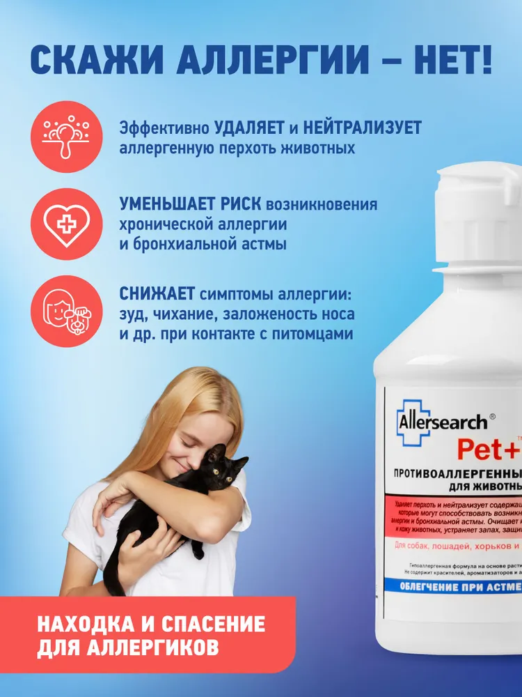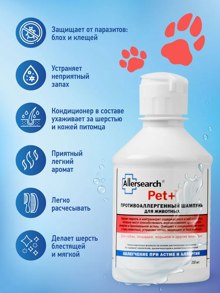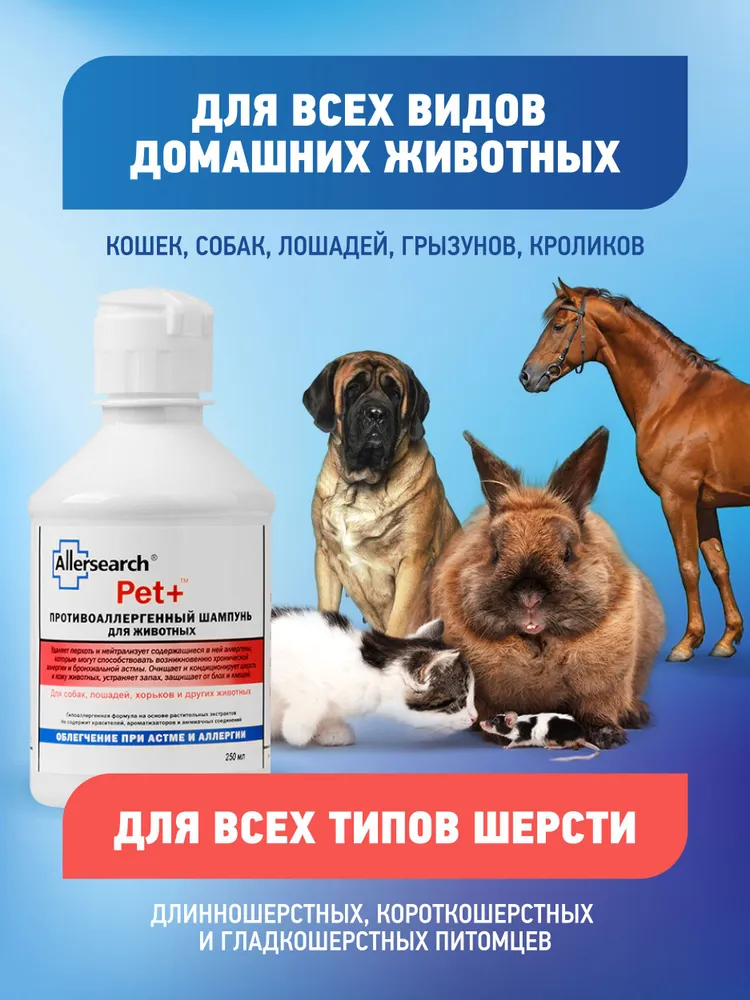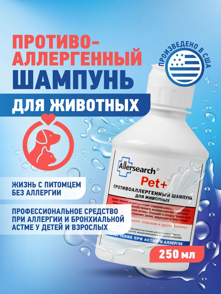 Профессиональный зоошампунь PET + лучшее решение для аллергиков и 100% облегчение при астме и аллергии.Высочайшее качество и эффективность американского средства из США доказано многочисленными откликами благодарных покупателей, решивших раз и навсегда проблему существования с питомцем при наличии аллергии!Лечебный шампунь для животных удаляет перхоть и полностью нейтрализует содержащиеся в ней аллергены, которые могут способствовать возникновению хронической круглогодичной аллергии и бронхиальной астмы у человека.Средство для ухода за животными надежно защитит вашего любимого питомца от паразитов - блох и клещей на срок до месяца и поможет держать ваш дом чистым и стерильным. Шампунь эффективно очищает шерсть и кожу животных, устраняет неприятный запах, помогает избавиться от запаха псины. Бальзам кондиционер в составе шампуня бережно ухаживает за шерстью и кожей питомца, не нарушая кожный барьер, предотвращая образование колтунов, в связи с чем подойдет и для пушистых питомцев.Увлажняющий собачий, кошачий и конский шампунь обладает приятным и легким ароматом, делает шерсть мягкой и шелковистой, облегчает ее расчесывание и способствует блеску. Средство для груминга и гигиены для кота и собачки помогает поддерживать нормальный баланс кожи животного.Вы можете использовать шампунь для всех видов домашних животных - собак, котов, лошадей, грызунов - кроликов, морских свинок, хорьков, хомяков, крыс, мышей. Очищающий универсальный eco шампунь также подойдет для бесшерстных лысых пород котиков - сфинкса, а также маленьких котят и щенков, благодаря его мягкой формуле.Противогрибковая косметика для мытья животных будет эффективна для купания длинношерстных, короткошерстных, гладкошерстных и жесткошерстных питомцев, а также всех видов пород собак и кошек - мелких, средних и крупных (хаски, мопс, померанский шпиц, чихуахуа, йоркширский терьер, йорк (йорков), лабрадор, пудель, корги, мальтийская болонка, французский бульдог, овчарка, самоед, ротвейлер, бигль, мейн кун / мейн-кунов, сфинксов).Биоразлагаемая формула нежного эко шампуня на основе растительных экстрактов не содержит красителей, ароматизаторов и аммиачных соединений.Одна обработка шампунем концентратом эффективно действует до 30 дней. Благодаря концентрированной формуле дерматологическое средство отлично пенится и одной бутылочки хватает надолго. Гипоаллергенный шампунь глубокой очистки для Ваших pets и cats удобен в использовании как на зиму, так и на лето. Рекомендуем хранить наши зоо zoo товары для животных в недоступном для детей месте.Сохраняйте свое здоровье и здоровье Вашего питомца с профессиональной серией зоотоваров и шампуней Allersearch, успешно зарекомендовавшей себя на протяжении многих лет и рекомендуемой каждым доктором аллергологом! Вы можете найти наш товар также по следующим запросам: пет+, пет +, алерсеч, аллерсеч.