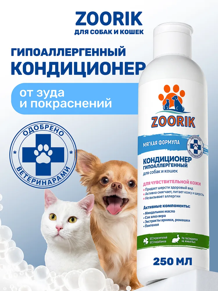 Создан для полноценного ухода за чувствительной кожей и деликатной шерстью ваших питомцев. Формула разработана с учётом потребностей животных, склонных к раздражениям и сухости. Кондиционер легко распределяется по шерсти, облегчая расчёсывание и устраняя спутанность.Растительное масло миндаля насыщает кожу питательными веществами, улучшает внешний вид шерсти, придаёт ей мягкость и ухоженный блеск. Экстракт ромашки оказывает выраженное успокаивающее действие, снимает покраснение, регулирует работу сальных желез и поддерживает естественный баланс кожи.Пантенол способствует восстановлению повреждённой структуры волоса, укрепляет и разглаживает шерсть, делая её гладкой и шелковистой. Алоэ вера глубоко увлажняет, предотвращает сухость и шелушение, создаёт комфорт даже после прогулок в непогоду. Экстракт арники активизирует обновление клеток, ускоряя процессы восстановления и повышая защитные свойства кожи.После использования шерсть становится послушной, блестящей и свежей, кожа — спокойной и увлажнённой. Идеальный выбор для ежедневного ухода за любимым питомцем.СПОСОБ ПРИМЕНЕНИЯ: после мытья шампунем равномерно нанести кондиционер на влажную кожу и шерсть животного, следуя по росту шерсти, помассировать для ускорения впитывания в течение 3-5 минут. Затем смыть теплой водой. Высушить питомца феном или полотенцем.E-COSMETIC – официальный поставщик ZOORIK.