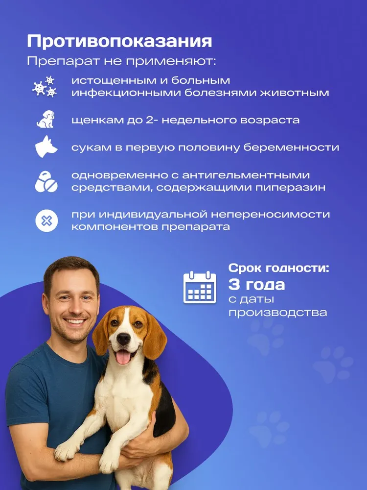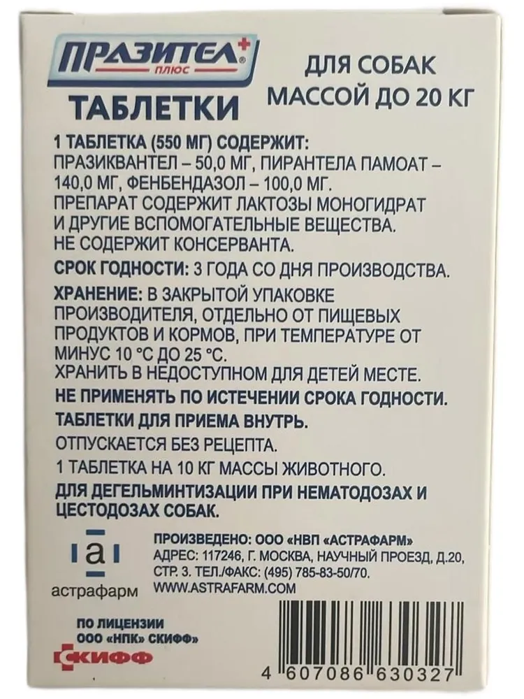 Комбинация входящих в состав препарата празиквантела, пирантела памоата и фенбендазола обеспечивает широкий спектр его антигельминтного действия на половозрелые фазы развития круглых и ленточных гельминтов, паразитирующих у собак и щенков. Празител для щенков и собак мелких и средних пород при однократном применении достигается в 95-100% случаев.Фармакологические свойства:Механизм действия входящих в состав лекарственного препарата активных веществ основан на ингибировании фумаратредуктазы, стойкой деполяризации мышечных клеток гельминта, нарушении энергетического обмена, что вызывает паралич и гибель паразита и способствует выведению его из желудочно-кишечного тракта.Назначение:Для профилактической и лечебной дегельминтизации нематодозов, цестодозов и смешанных инвазий у собак и щенков.Применение:препарат применяется из расчета 1 таблетка на 10 кг веса животного. Щенкам массой 2-3 кг – 1/4 таблетки, массой 4-5 кг – 0,5 таблетки, массой 6-10 кг – 1 таблетка. При сильной степени зараженности обработку необходимо повторить через 10 дней. Профилактическую дегельминтизацию необходимо проводить один раз в 3 месяца, а также за 10 дней до вакцинации. Предварительной голодной диеты и применение слабительных средств не требуется.Противопоказания:Препарат не применяют истощённым и больным инфекционными болезнями животным, щенкам до 2-недельного возраста, сукам в первую половину беременности, одновременно с антигельминтными средствами, содержащими пиперазин, а также при индивидуальной непереносимости компонентов препарата.