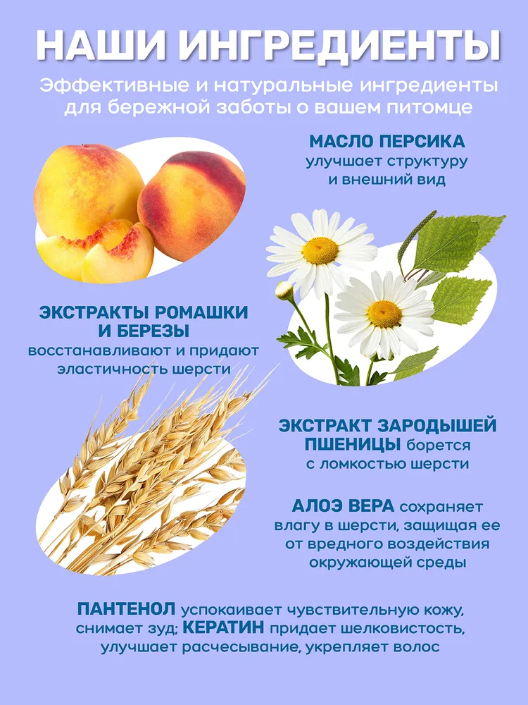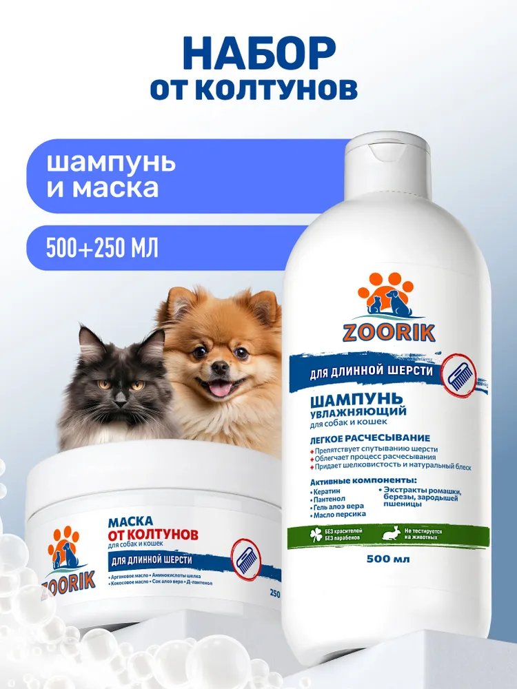 Идеальное решение для заботы о длинной и склонной к спутыванию шерсти — набор ZOORIK сочетает шампунь и маску, которые работают в тандеме, обеспечивая глубокое питание, восстановление и легкое расчесывание. Регулярный уход с этим комплектом помогает избежать образования колтунов, облегчает укладку и поддерживает здоровый вид питомца.Шампунь бережно очищает от загрязнений, при этом насыщает каждый волосок ценными компонентами. Масло персика и сок алоэ смягчают, снимают раздражение, возвращая шерсти эластичность. Экстракты ромашки и березы обладают природными антисептическими свойствами. Пшеничный компонент и гидролизованный кератин укрепляют, делая структуру волосков более устойчивой к повреждениям, а пантенол обеспечивает дополнительную защиту от сухости.Маска глубоко увлажняет и запечатывает влагу внутри волоса. Масла арганы и кокоса придают гладкость и блеск, аминокислоты шелка разглаживают поверхность шерсти, предотвращая её спутывание. Алоэ и пантенол усиливают защитные функции кожи и создают ощущение комфорта после каждого мытья.Результат — гладкая, блестящая, послушная шерсть, лёгкое расчёсывание и опрятный внешний вид без колтунов.СПОСОБ ПРИМЕНЕНИЯ: обильно смочить шерсть теплой водой. Развести шампунь с теплой водой в пропорции 1/3, с помощью губки равномерно нанести на влажную шерсть, слегка втирая до образования пены. Тщательно смыть теплой проточной водой. Высушите питомца полотенцем и расчешите. Противопоказания: индивидуальная непереносимость компонентов.После шампуня нанесите маску и оставьте на 3 минуты. Расчешите шерсть расческой или щеткой, затем тщательно смойте теплой водой.E-COSMETIC – официальный поставщик ZOORIK.