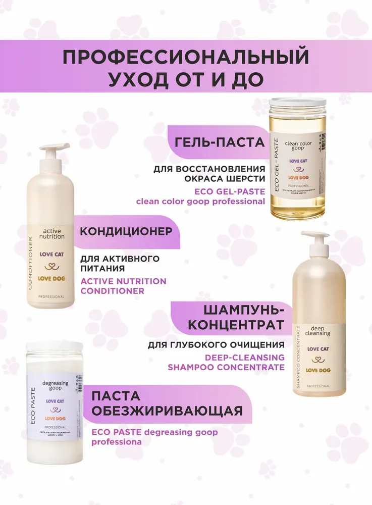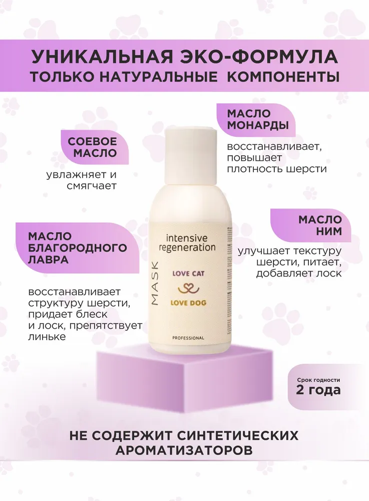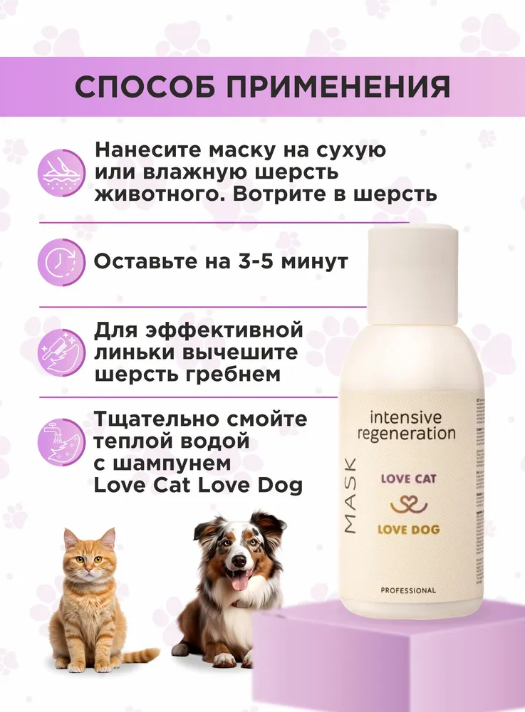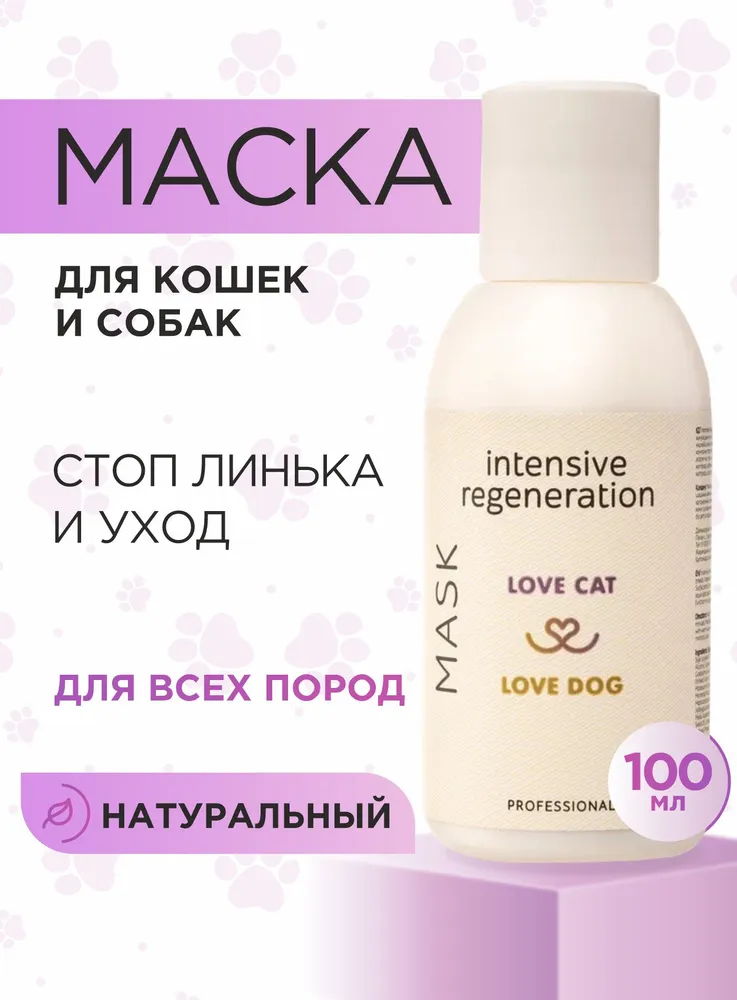 Станьте профессиональным грумером и стилистом для любимого питомца вместе с органической серией по уходу за собаками и кошками LOVE CAT LOVE DOG.Маска от линьки для собак и кошек Интенсивное восстановление питает каждый волосок вашего питомца, восстанавливает защитную функцию оболочки волоса. Повышает плотность, активно смягчает и увлажняет шерсть. Максимально облегчает вычесывание и работает как экспресс линька.Мы разработали маску для собак от линьки и шампунь для кошек, а также другие уникальные средства для ухода за животными с учетом опыта профессиональных грумеров и заводчиков.Органическая маска экспресс линька для собак и кошек заботится не только о шерсти, но и не повреждает кожу ваших рук, в отличие от обычных синтетических средств. Мы за безопасное и приятное купание для всех участников!Маска от линьки отлично подходит для ухода за длинношерстными собаками или кошками.Соевое масло благодаря своему уникальному составу эффективно увлажняет и смягчает, а жирные кислоты в составе масла регулируют работу эпидермального барьера и усиливают влагоудерживающие способности.Масло монарды имеет восстанавливающие свойства, повышает плотность шерсти.Масло благородного лавра восстанавливает структуру шерсти собак и кошек, придает блеск и лоск, препятствует линьке.Масло ним улучшает текстуру волоса и обладает питательными веществами, необходимыми для блеска шерсти.Даже если ваш любимый хвостик долгое время обходился без мытья, комплекс средств по уходу за собаками и кошками LOVE CAT LOVE DOG поможет выглядеть так, как будто он побывал в дорогом груминг-салоне. Здоровые, ухоженные на профессиональном уровне шерсть и кожа четвероногого друга - без лишних трат и поездок. И всё это в привычных домашних условиях, никаких переживаний и стресса!Рекомендации по уходу:Обработайте засаленные, жирные, особо грязные участки шерсти Пастой для сильно загрязненных шерсти и кожи. Обратите пристальное внимание на пробор хвоста, зону за ушами, под глазами животного.Пока паста растворяет загрязнения, распределите Гель-пасту для обновления цвета и структуры волоса по всей шерсти. Хорошо помассируйте.Смойте пасту и гель с шерсти. Нанесите подходящий Шампунь для собак и кошек или Шампунь-концентрат из нашей линейки: для Глубокого очищения, для Деликатного очищения, для Шикарного объема, для Особого блеска, для Жесткой шерсти.Помассируйте всё тело животного. Рекомендуем сначала вспенить шампунь губкой.Тщательно промойте шерсть.Завершите уход кондиционером для кошек и собакли маской, в зависимости от потребностей шерсти вашего питомца. Усилит полученный результат Спрей-сыворотка.Мы гарантируем:растительные, натуральные ароматы наших продуктов нейтрализует неприятный запах шерсти;оптимальный именно для вас объем от 100 мл до 10 л для домашнего и профессионального использования;экономичный расход каждого средства. Например, горошины кондиционера хватит для кошки или небольшой собаки;никаких вредных химических добавок в составе, только польза натуральных компонентов;шампуни не вызывают привыкания, раз за разом действуют мягко и эффективно.