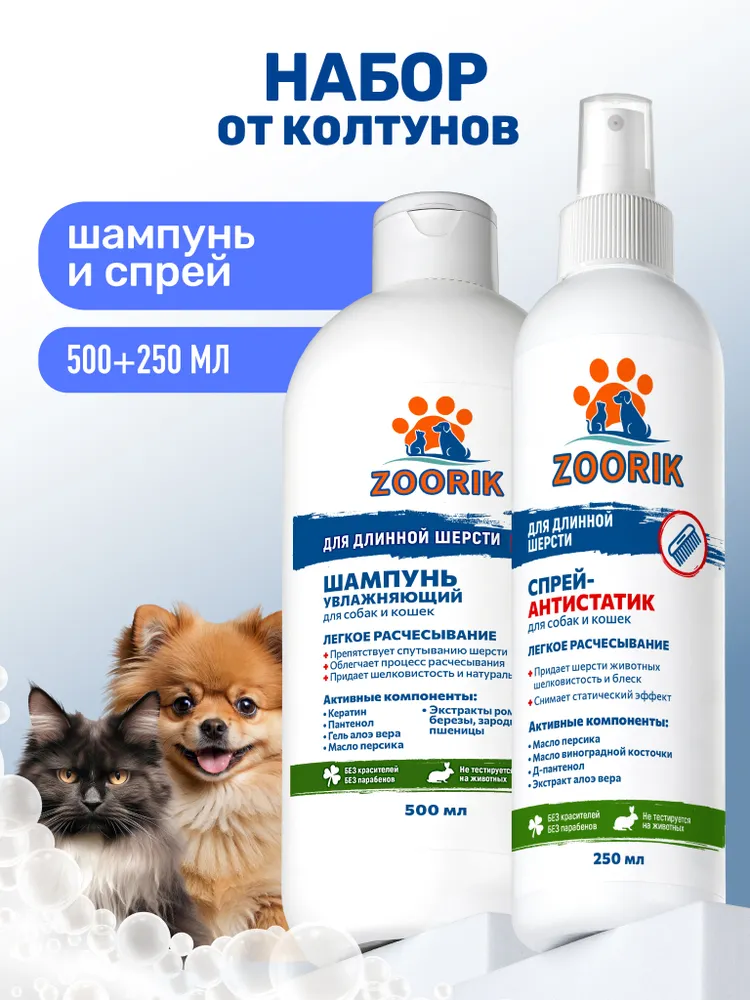 Идеальное решение для питомцев с длинной, склонной к спутыванию шерстью. Шампунь из набора бережно очищает кожу, не пересушивая, и помогает мягко распутать шерстяной покров. Масло персика и вытяжка из зародышей пшеницы восстанавливают структуру волосков по всей длине, алоэ вера увлажняет, кератин укрепляет, а экстракты ромашки и берёзы придают ухоженный, здоровый вид. После первого применения шерсть становится мягкой, блестящей и легко расчёсывается.Спрей завершает уход, создавая лёгкий защитный слой. Благодаря комбинации масел персика и виноградной косточки, он питает и разглаживает, предотвращая образование колтунов. Алоэ поддерживает водный баланс кожи, а пантенол смягчает, придавая свежесть и шелковистость.Этот дуэт избавит владельцев от мучительного расчесывания и потери шерсти, подарит питомцу комфорт, а вам — радость от гладкой, блестящей и чистой шубки без спутанных участков. Идеально подходит для регулярного ухода, подчёркивает красоту животного и облегчает ежедневный груминг.СПОСОБ ПРИМЕНЕНИЯ: обильно смочить шерсть теплой водой. Развести шампунь с теплой водой в пропорции 1/3, с помощью губки равномерно нанести на влажную шерсть, слегка втирая до образования пены. Тщательно смыть теплой проточной водой. Высушите питомца полотенцем и расчешите.Спрей нанести на сухую или влажную шерсть после мытья и расчесать. Не требует смывания. Противопоказания: индивидуальная непереносимость компонентов.E-COSMETIC – официальный поставщик ZOORIK.