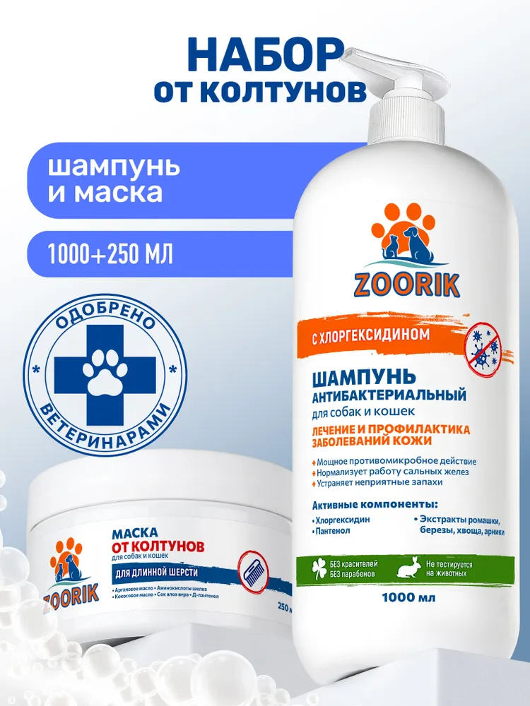 Набор ZOORIK создан для заботливых владельцев, которые хотят не просто помыть питомца, а подарить ему полноценный уход. Шампунь глубоко очищает, устраняя загрязнения, запахи и излишки жира, при этом мягко воздействует на кожу. В составе — натуральные экстракты ромашки, арники, берёзы и полевого хвоща, которые снимают раздражения, уменьшают зуд и помогают восстановить комфорт даже после прогулок в пыли или грязи. Хлоргексидин обеспечивает дополнительную защиту, а пантенол и растительный глицерин увлажняют и предотвращают сухость.Маска дополняет действие шампуня: аргановое и кокосовое масла питают, возвращая блеск, гладкость и шелковистость. Аминокислоты шелка усиливают мягкость, кератин и сок алоэ способствуют восстановлению текстуры. После использования исчезает жесткость, улучшается расчёсываемость, появляется ухоженный внешний вид.Набор решает сразу несколько задач — чистота, защита, питание и восстановление. Результат — мягкая, блестящая шерсть без спутанности и сухости, а довольный питомец радует глаз.СПОСОБ ПРИМЕНЕНИЯ: развести шампунь с теплой водой в пропорции 1/3, с помощью губки равномерно нанести на влажную шерсть, уделяя особое внимание пораженным участкам и складочкам на коже, массировать до образования пены. Оставить на 3-5 минут. Тщательно смыть теплой водой. При воспалении провести 10-15 процедур, 3-4 раза в неделю. Далее использовать шампунь в профилактических целях 2-3 раза в месяц. После шампуня нанесите маску и оставьте на 3 минуты. Расчешите шерсть расческой или щеткой, затем тщательно смойте теплой водой. Противопоказания: индивидуальная непереносимость компонентов.E-COSMETIC – официальный поставщик ZOORIK.